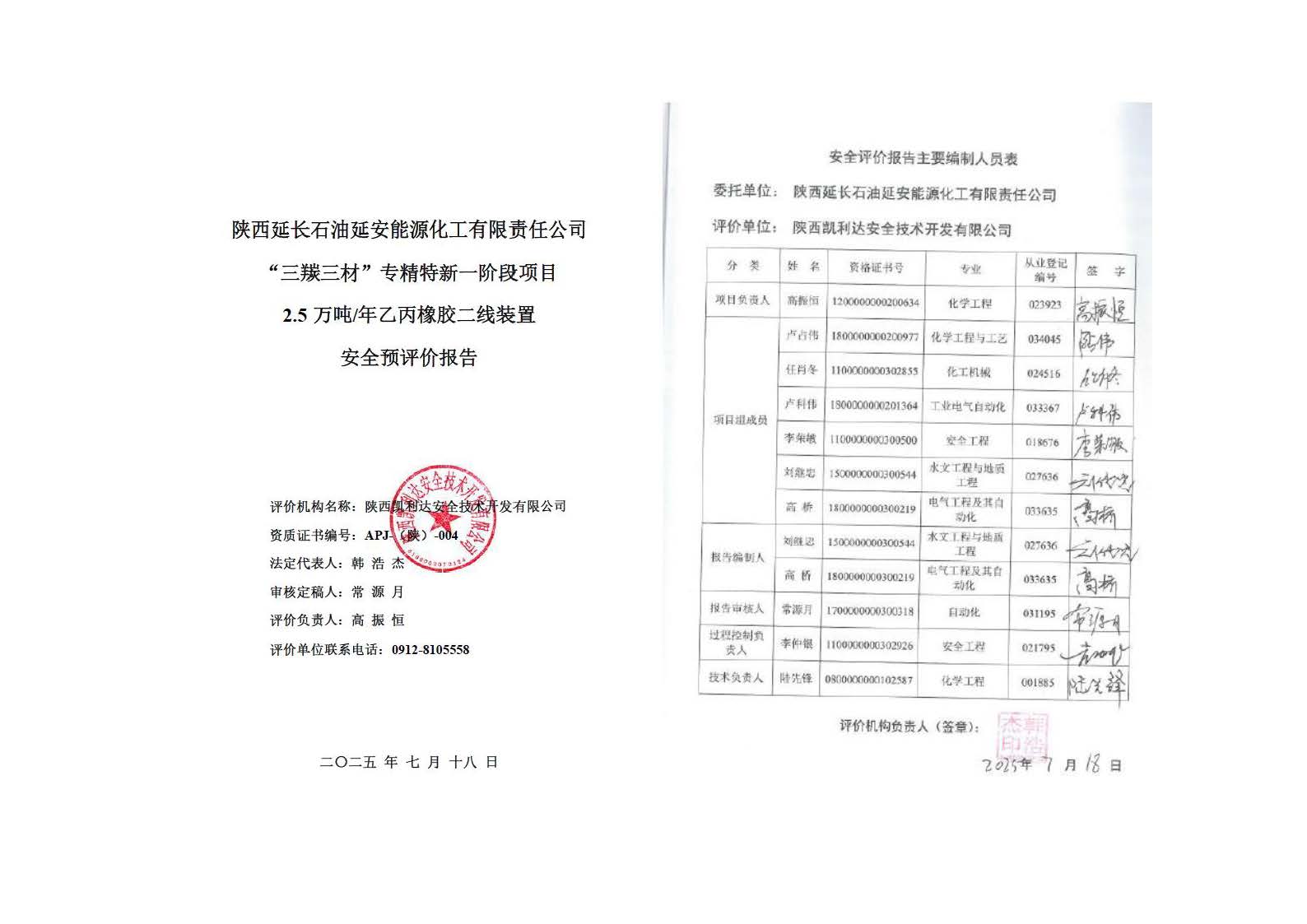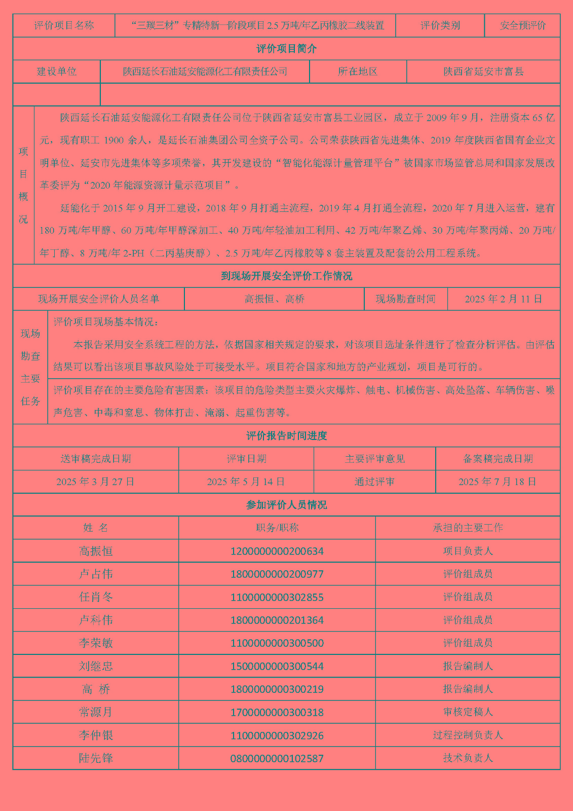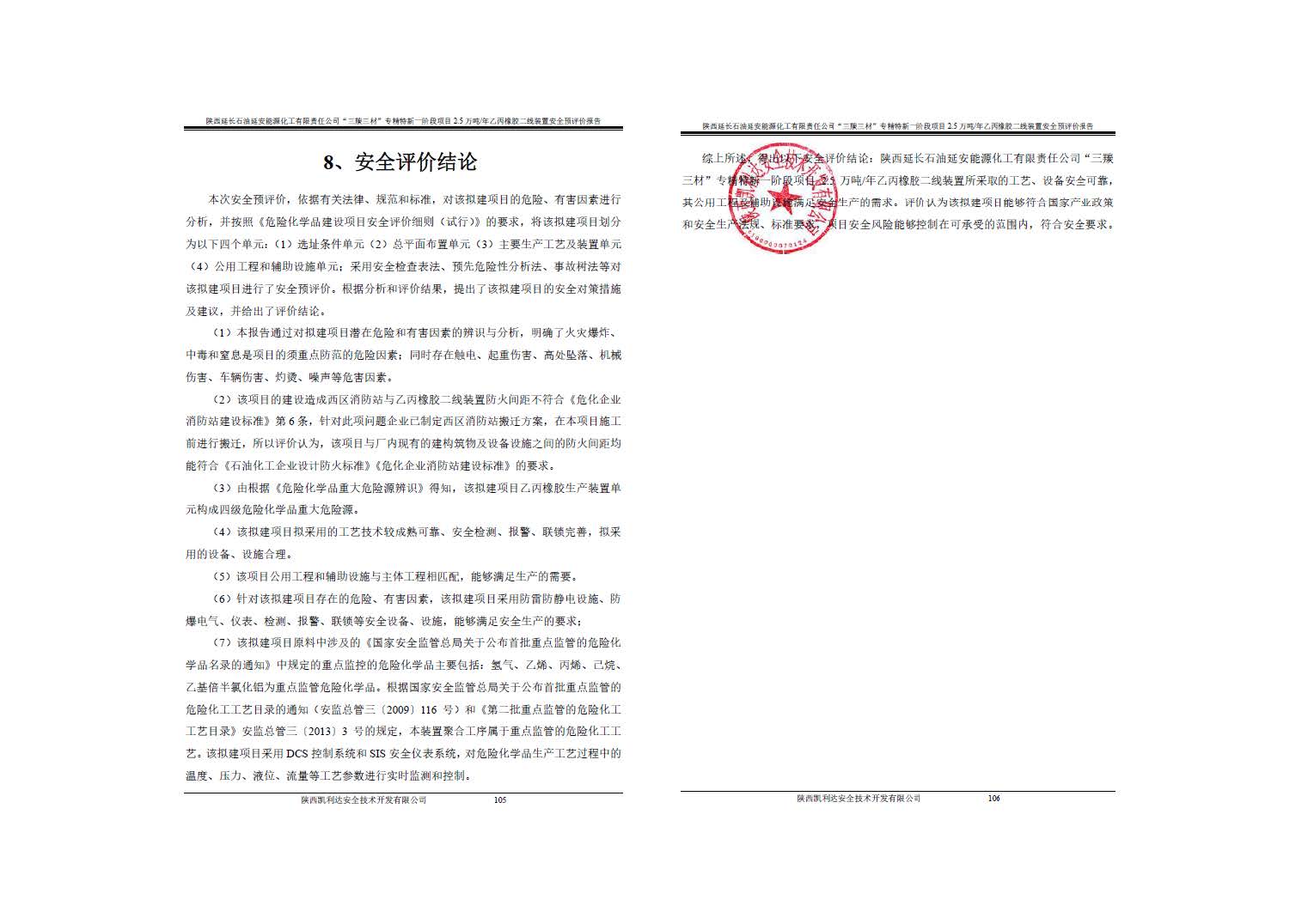 陜西延長石油延安能源化工有限責任公司“三羰三材”專精特新一階段項目2.5萬噸/年乙丙橡膠二線裝置安全預評價