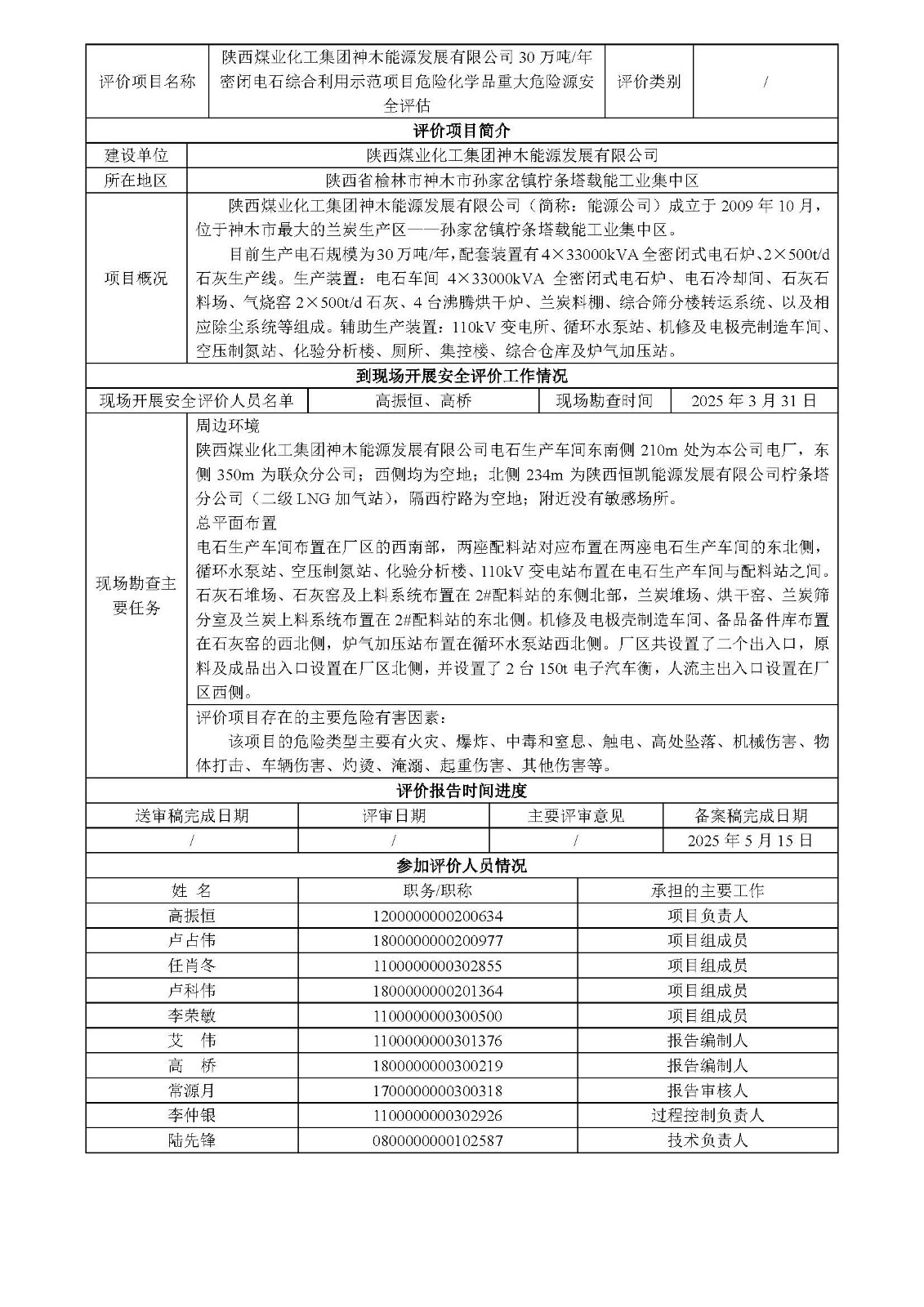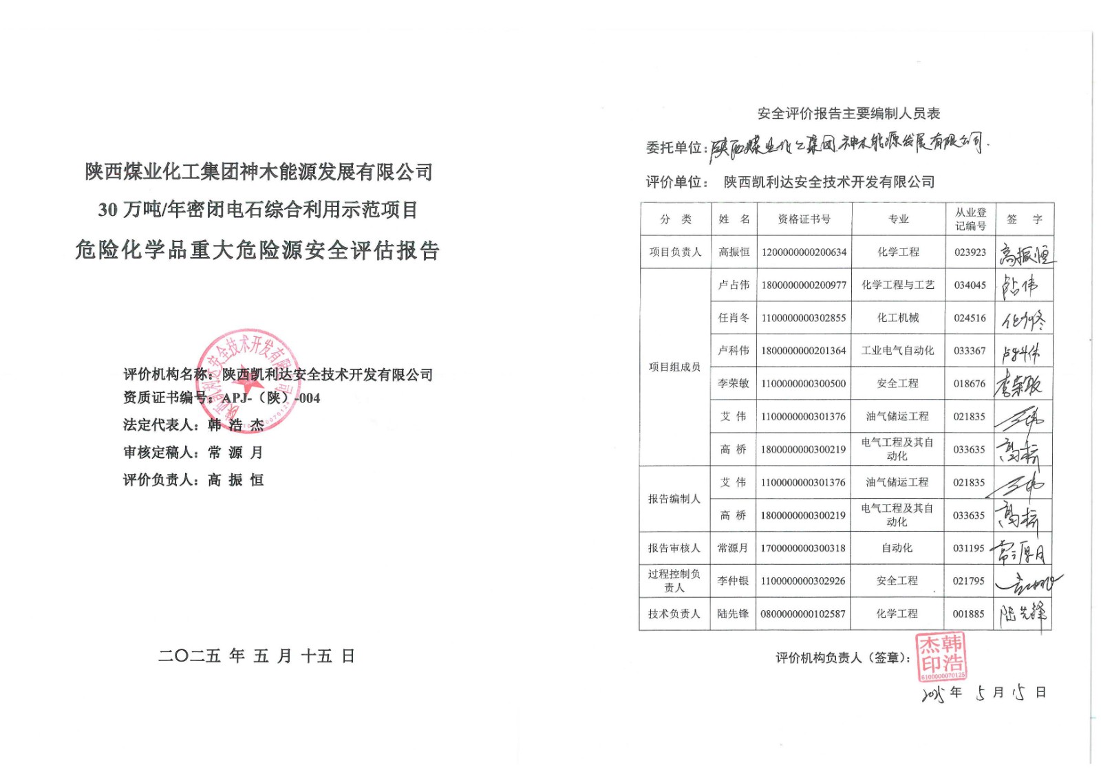 KLDAP-[2025]-2.10陜西煤業化工集團神木能源發展有限公司30萬噸年密閉電石綜合利用示范項目危險化學品重大危險源安全評估報告