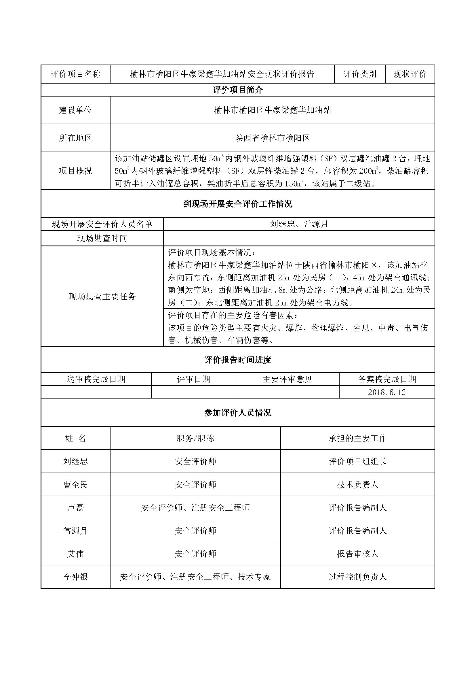 榆林市榆陽區牛家梁鑫華加油站安全現狀評價