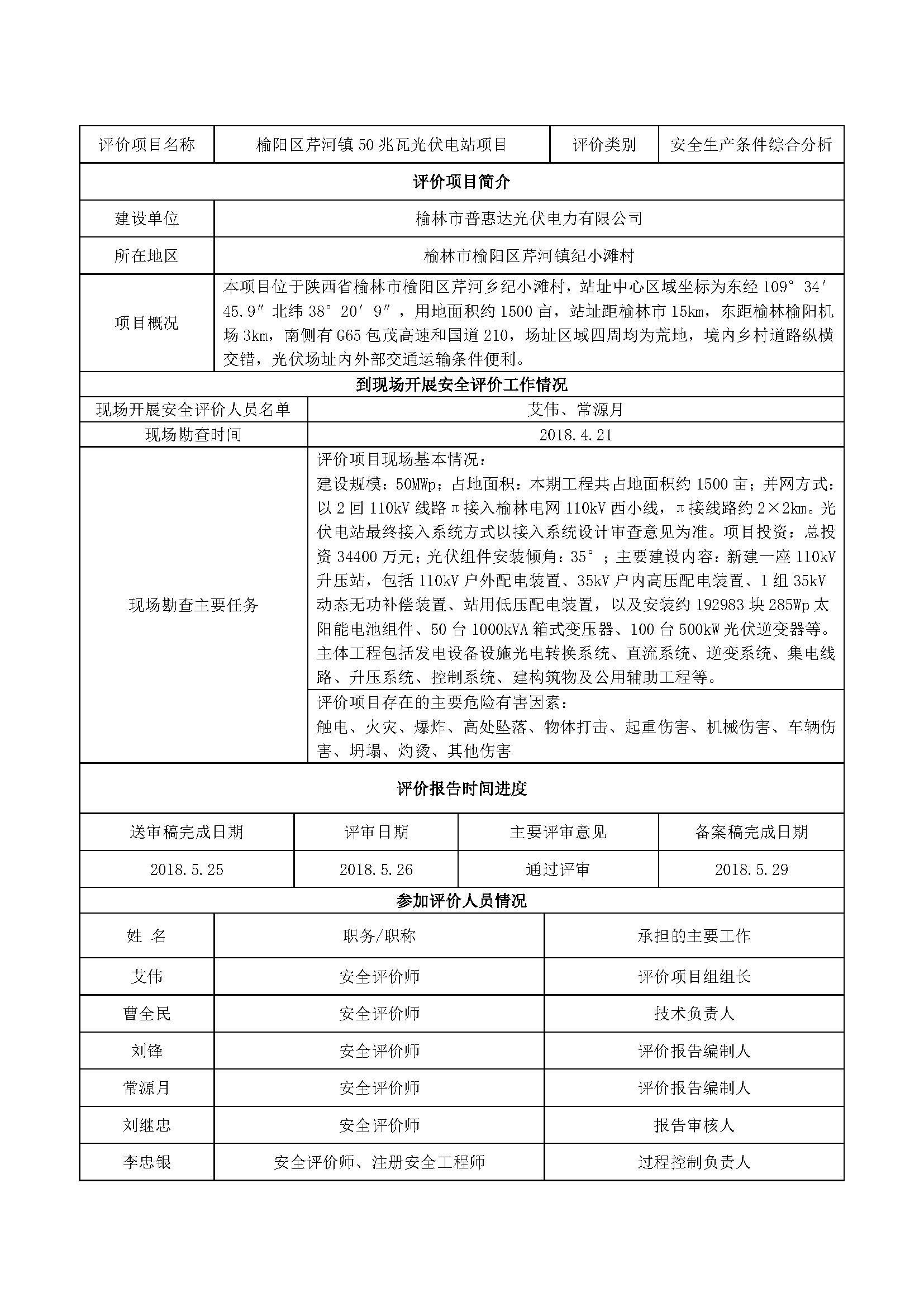 榆林市普惠達光伏電力有限公司榆陽區芹河鎮50兆瓦光伏電站項目安全條件綜合分析