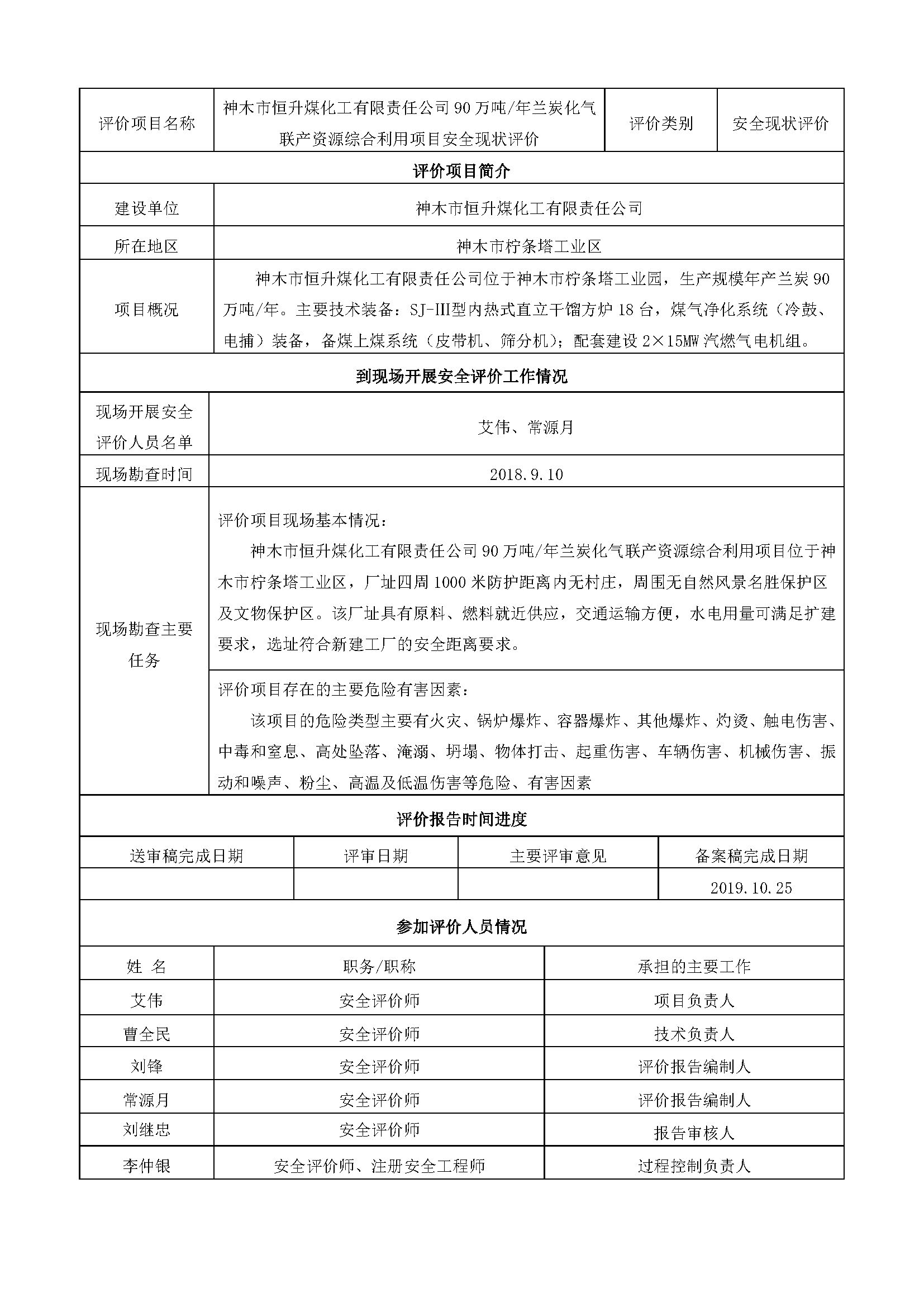 神木市恒升煤化工有限責(zé)任公司90萬噸年蘭炭化氣聯(lián)產(chǎn)資源綜合利用項(xiàng)目安全現(xiàn)狀評(píng)價(jià)