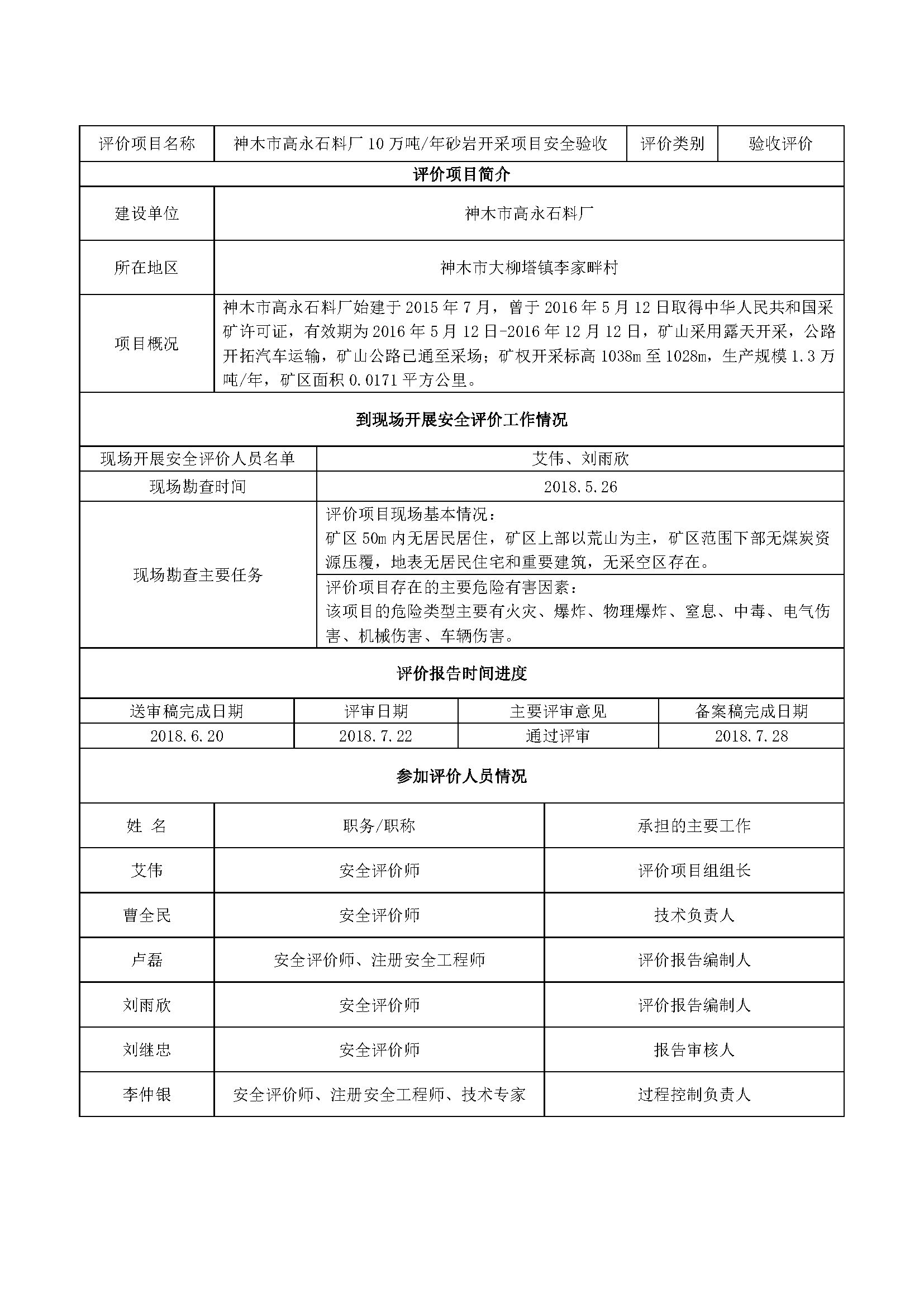 神木市高永石料廠10萬噸年砂巖開采項目安全驗收評價