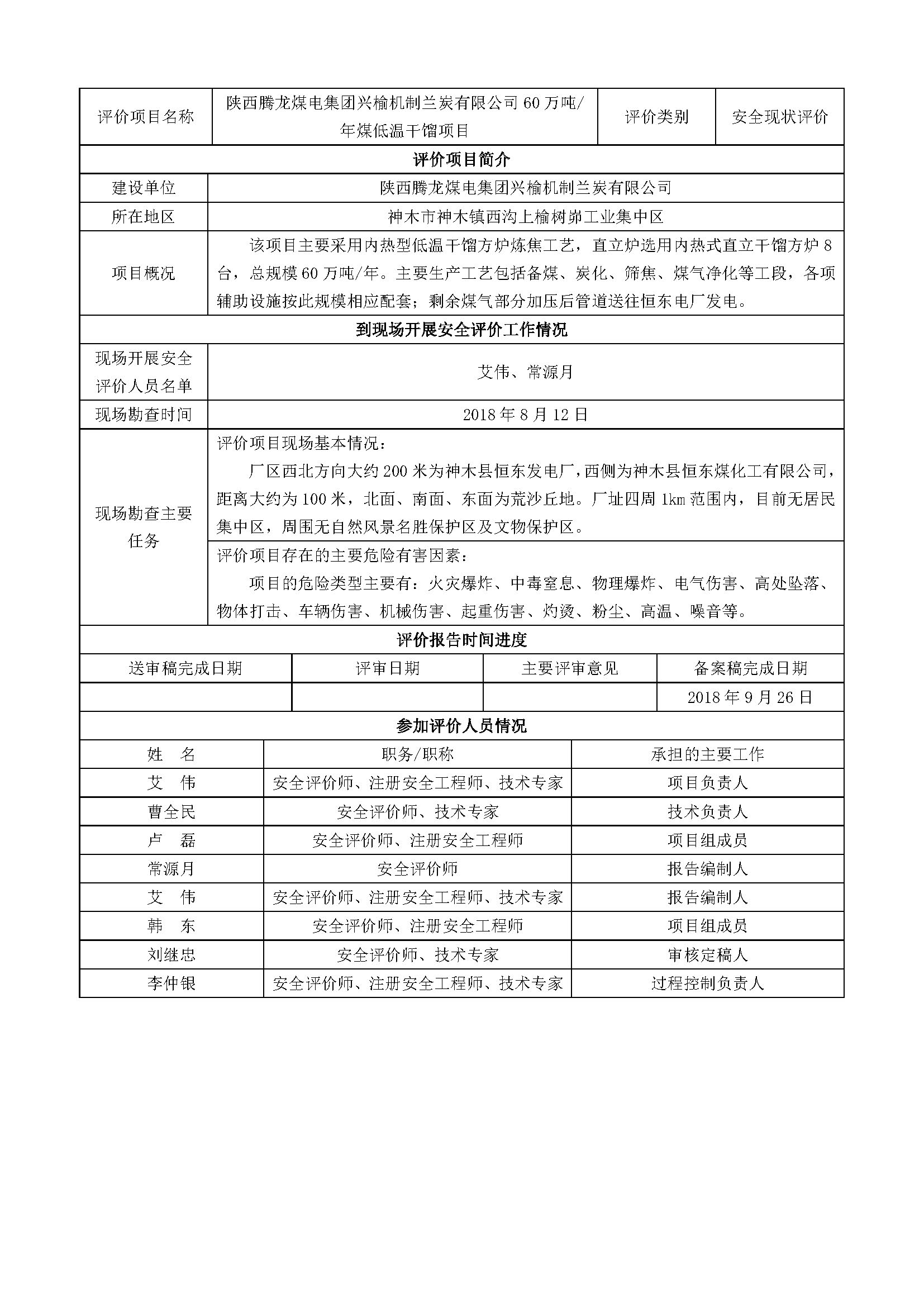 陜西騰龍煤電集團興榆機制蘭炭有限公司60萬噸年煤低溫干餾項目安全現狀評價