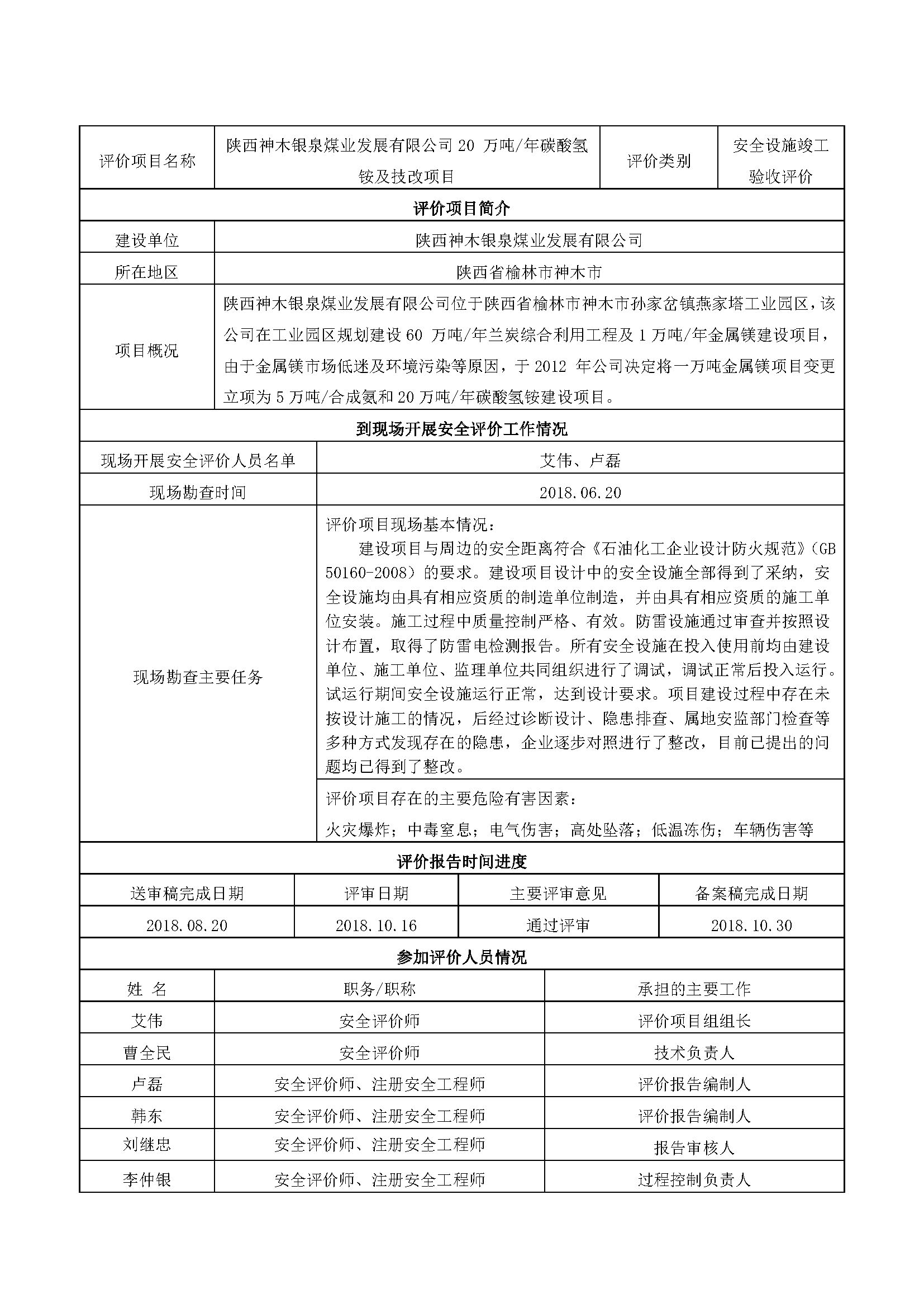 陜西神木銀泉煤業發展有限公司20萬噸年碳酸氫銨及技改項目安全設施竣工驗收評價
