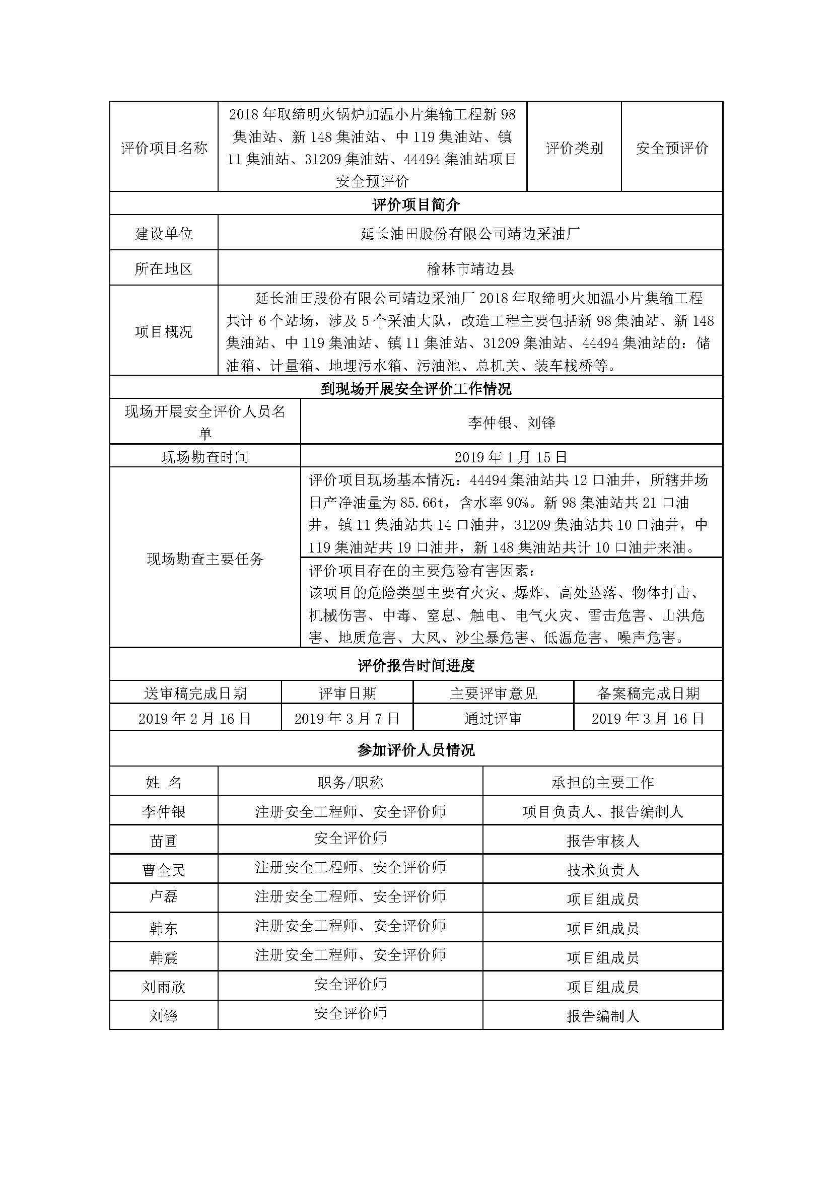 KLDAP[2019]-非煤-預(yù)-2 延長油田股份有限公司靖邊采油廠2018年取締明火加溫小片集輸工程新98集油站等6座站場安全預(yù)評價