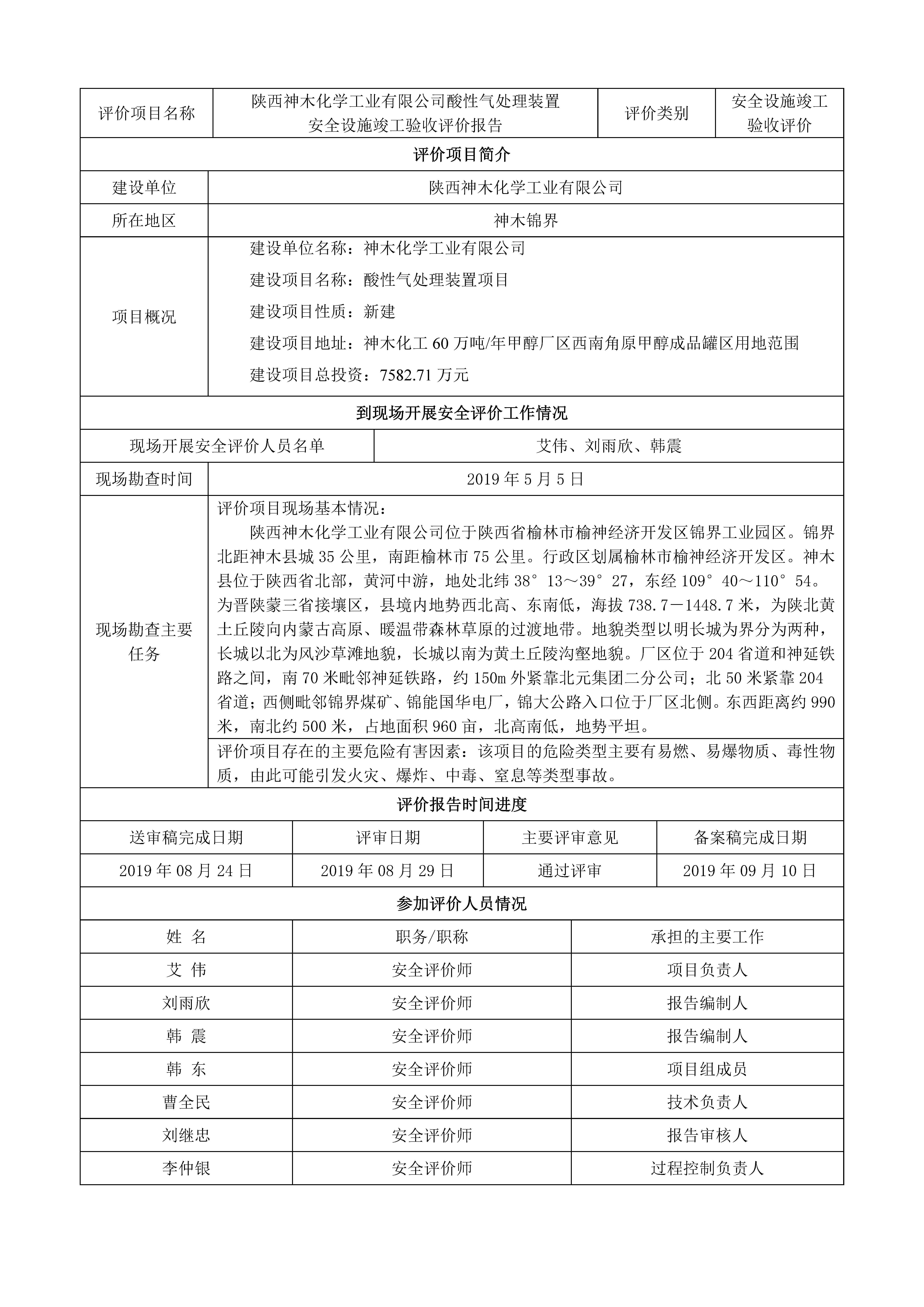KLDAP[2019]-危化-驗-3 陜西神木化學工業有限公司酸性氣處理裝置安全驗收評價