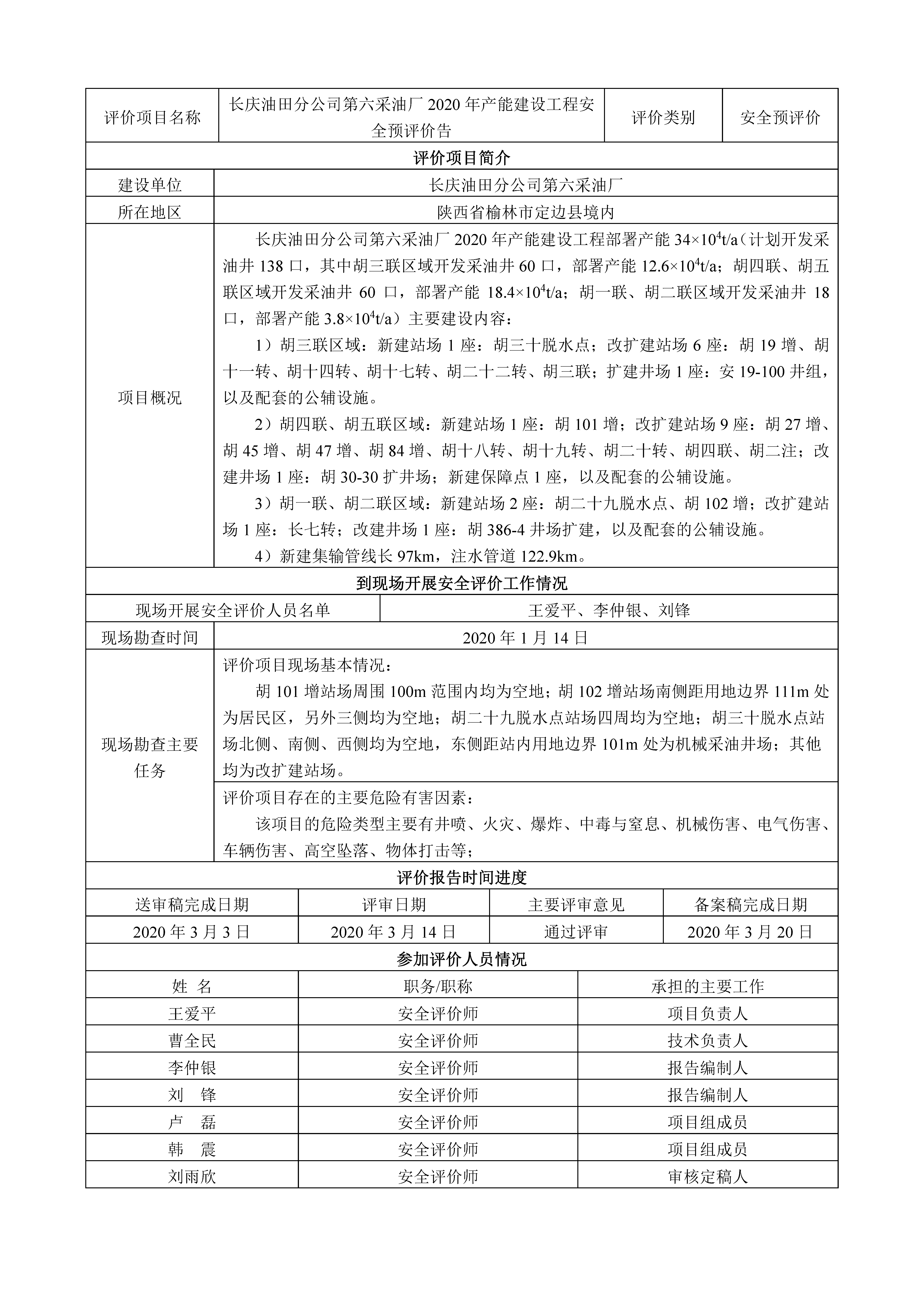 KLDAP[2019]-非煤-預-4 長慶油田分公司第六采油廠2020年產能建設工程安全預評價