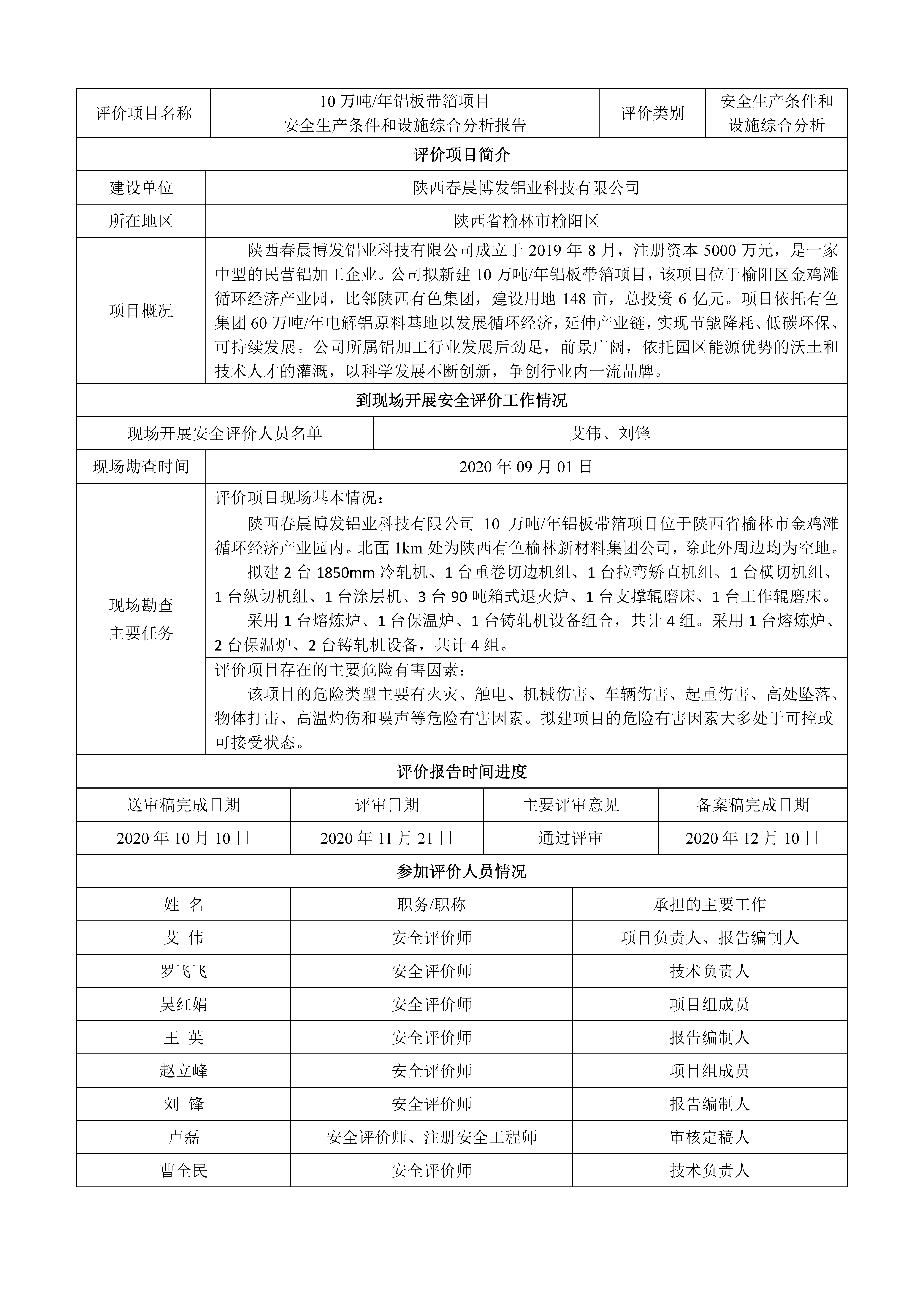 KLDAP[2020]-工貿(mào)-預(yù)-3 陜西春晨博發(fā)鋁業(yè)科技有限公司10萬(wàn)噸年鋁板帶箔項(xiàng)目安全條件綜合分析