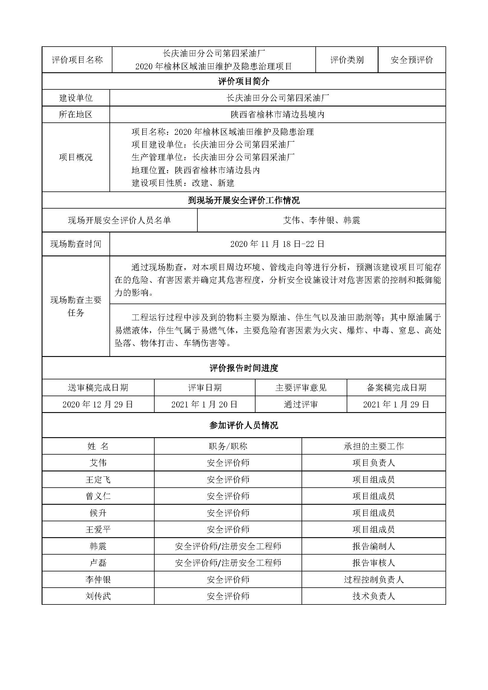KLDAP[2020]-非煤-預-2 中國石油天然氣股份有限公司第四采油廠2020年榆林區域油田維護及隱患治理項目安全預評價