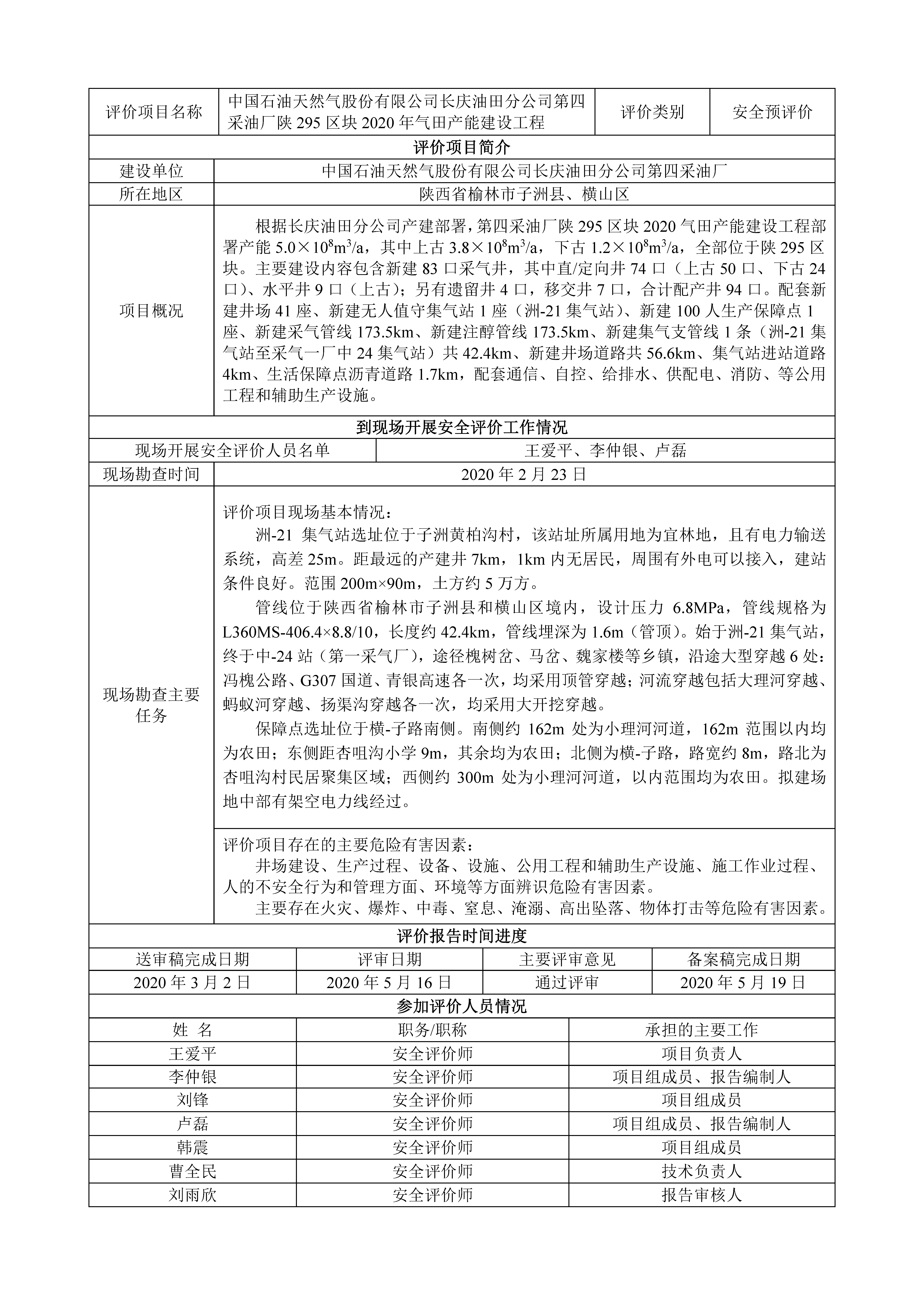 KLDAP[2020]-非煤-預-1 中國石油天然氣股份有限公司長慶油田分公司第四采油廠陜295區塊2020年氣田產能建設工程安全預評價