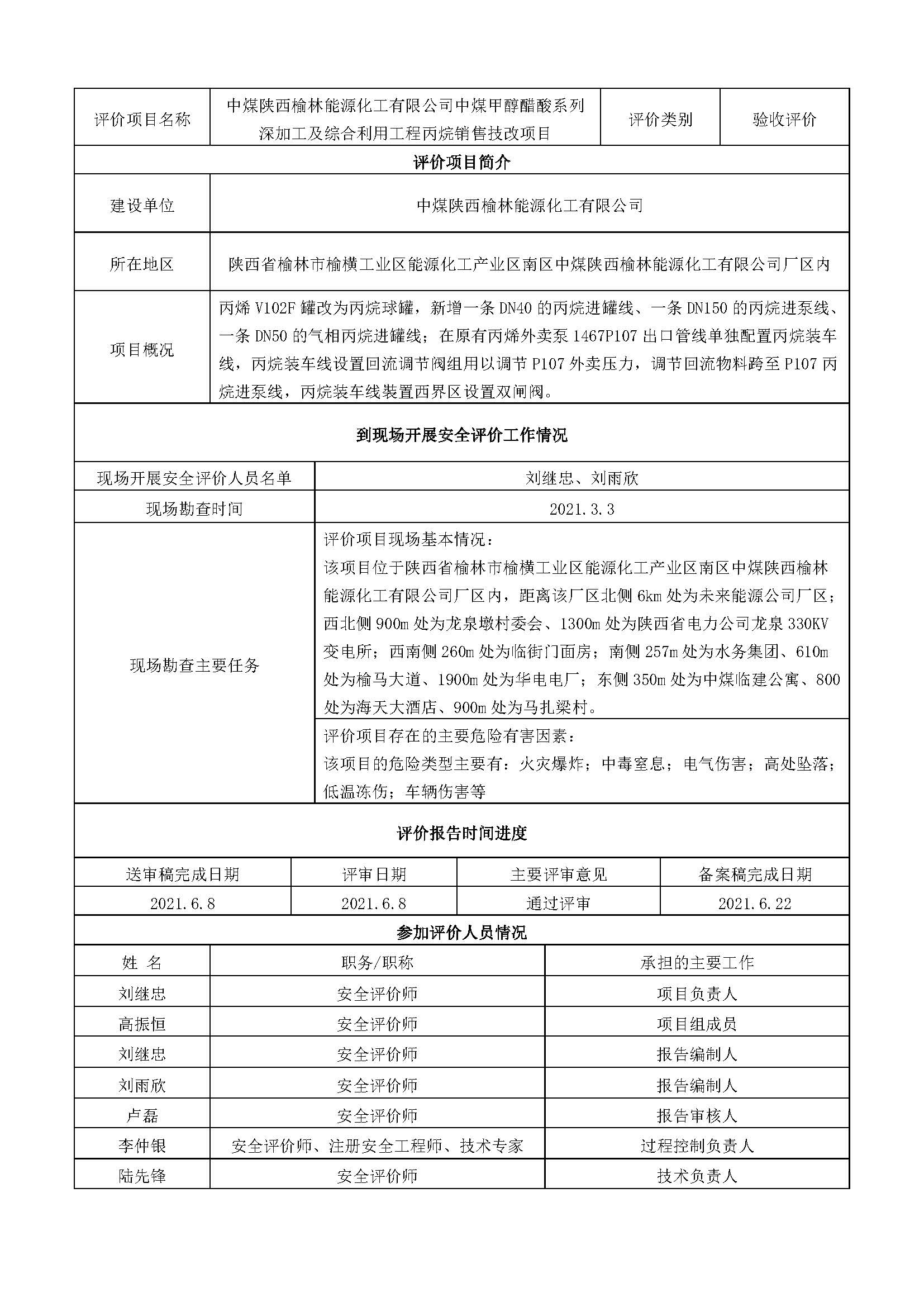 KLDAP[2021]-危化-驗-2 中煤陜西榆林能源化工有限公司中煤甲醇醋酸系列深加工及綜合利用工程丙烷銷售技改項目安全設施竣工驗收評價