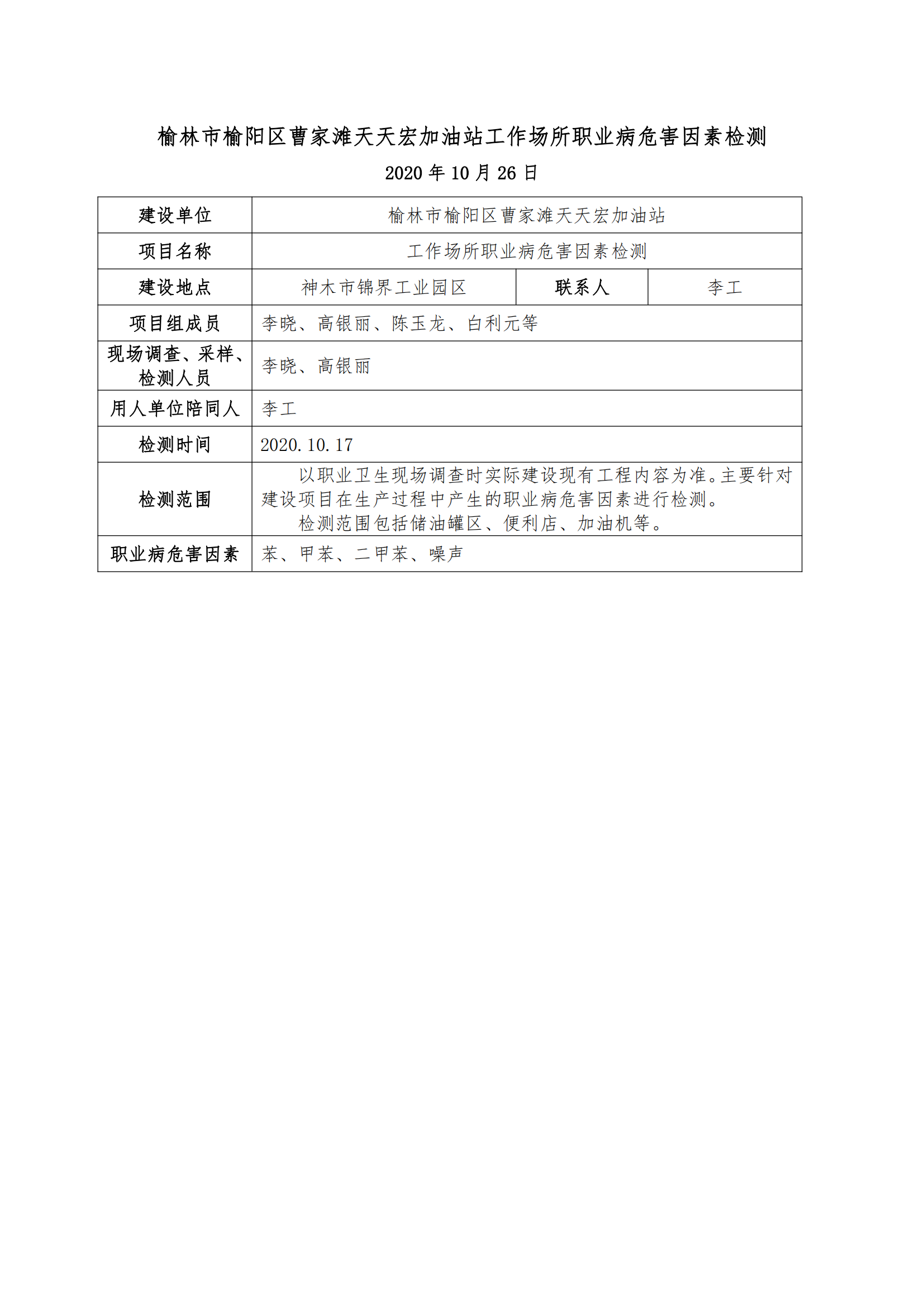 榆林市榆陽區曹家灘天天宏加油站工作場所職業病危害因素檢測