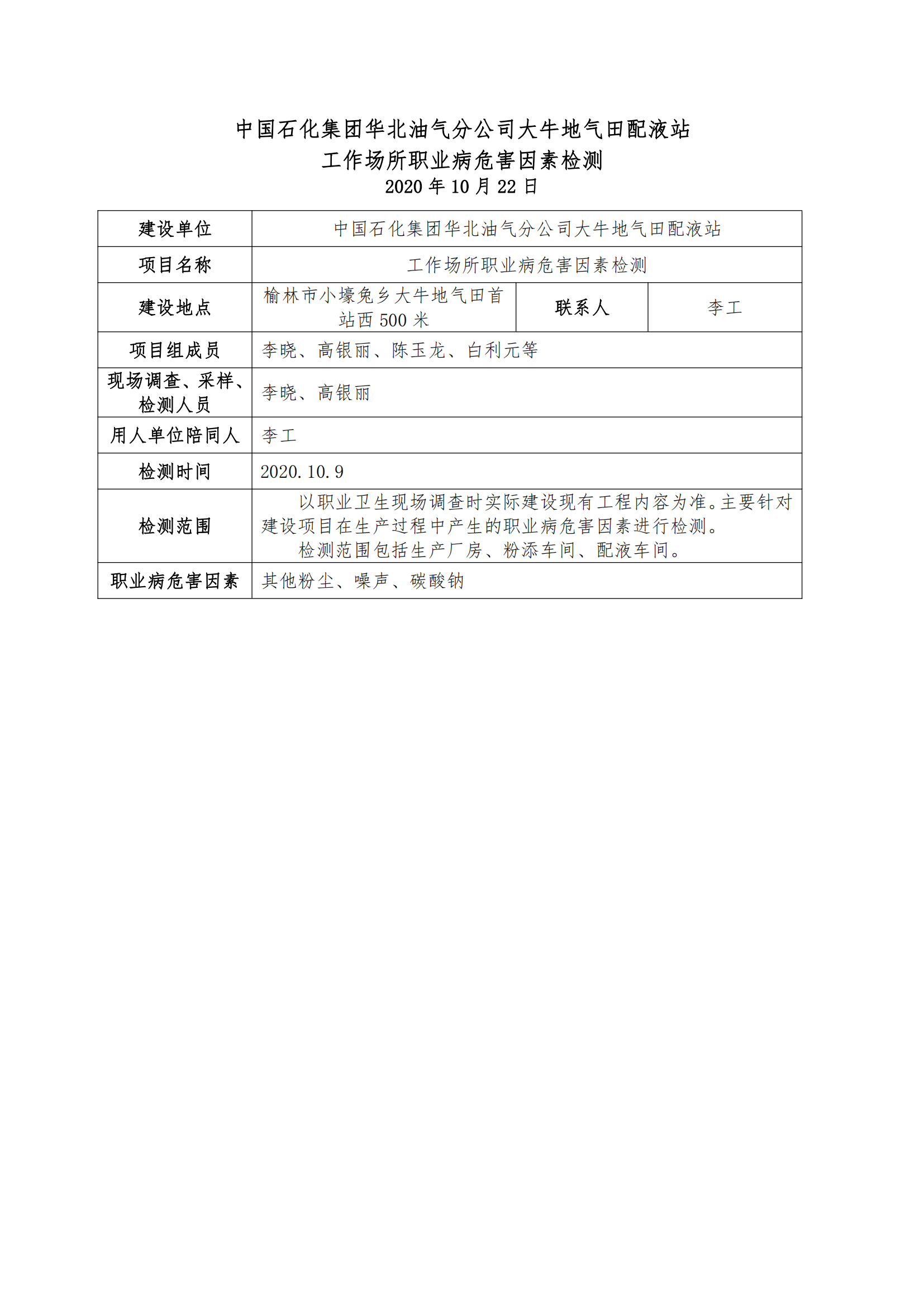 中國石化集團華北油氣分公司大牛地氣田配液站工作場所職業病危害因素檢測