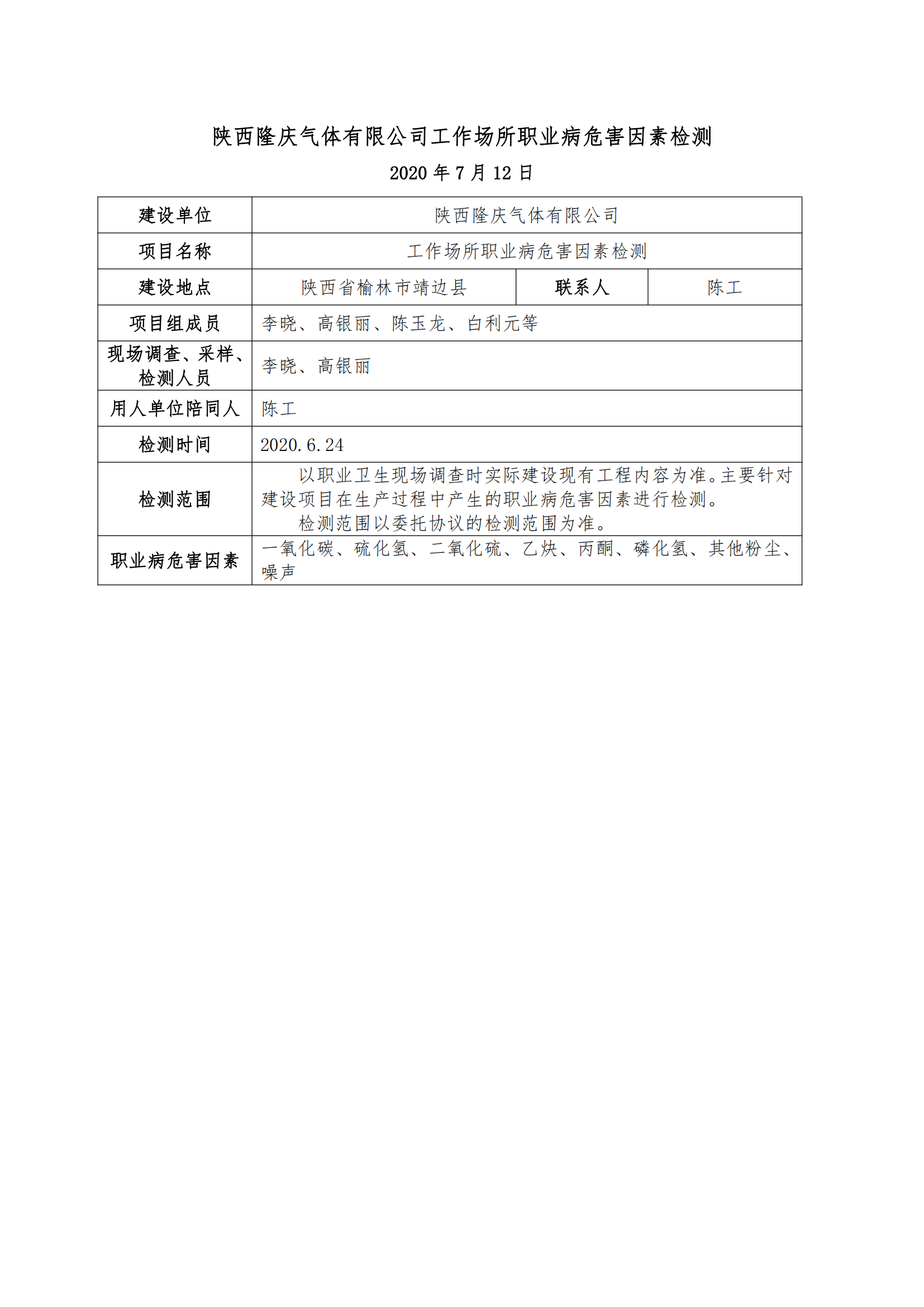 陜西隆慶氣體有限公司工作場所職業(yè)病危害因素檢測