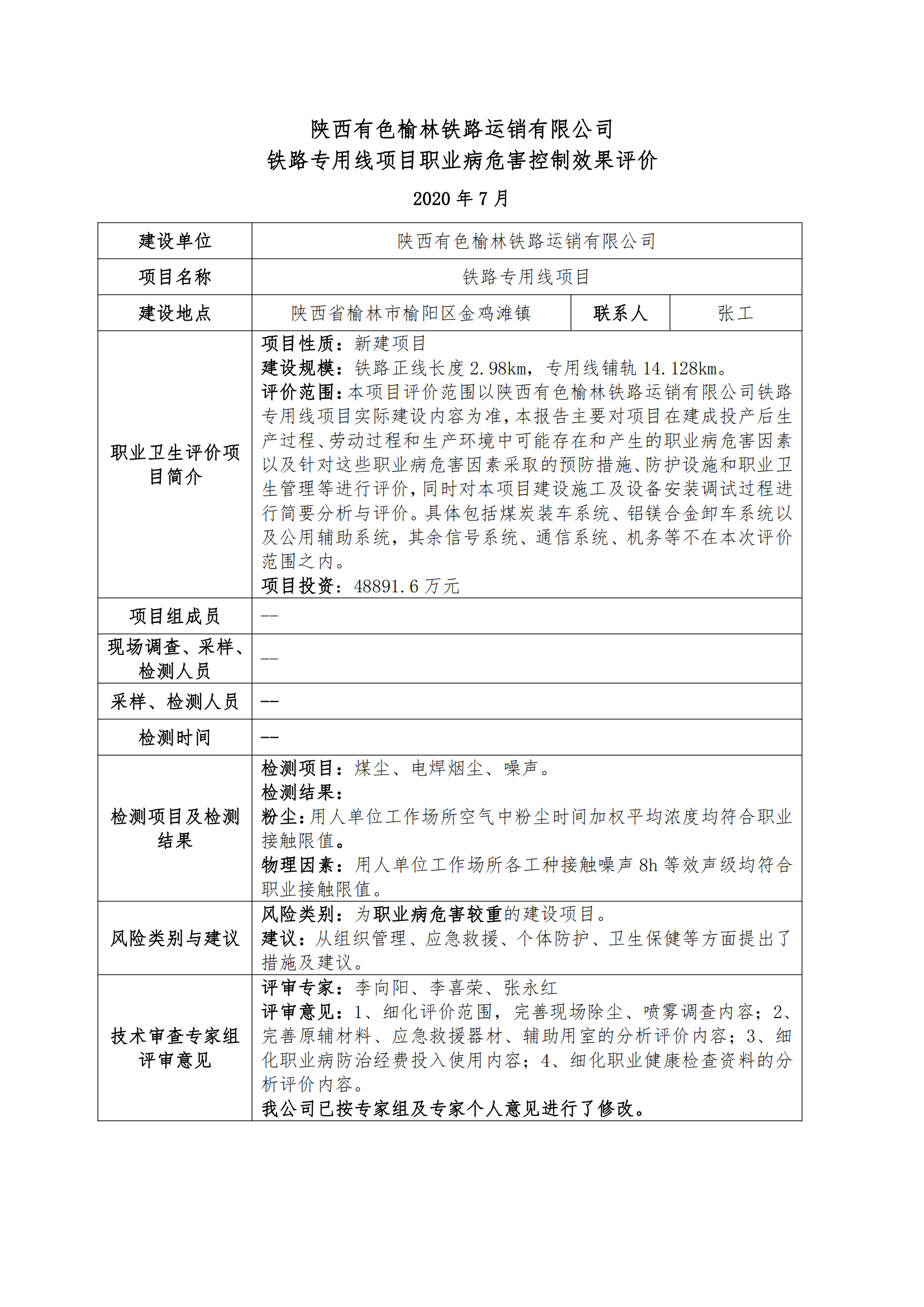陜西有色榆林鐵路運銷有限公司鐵路專用線項目職業病危害控制效果評價