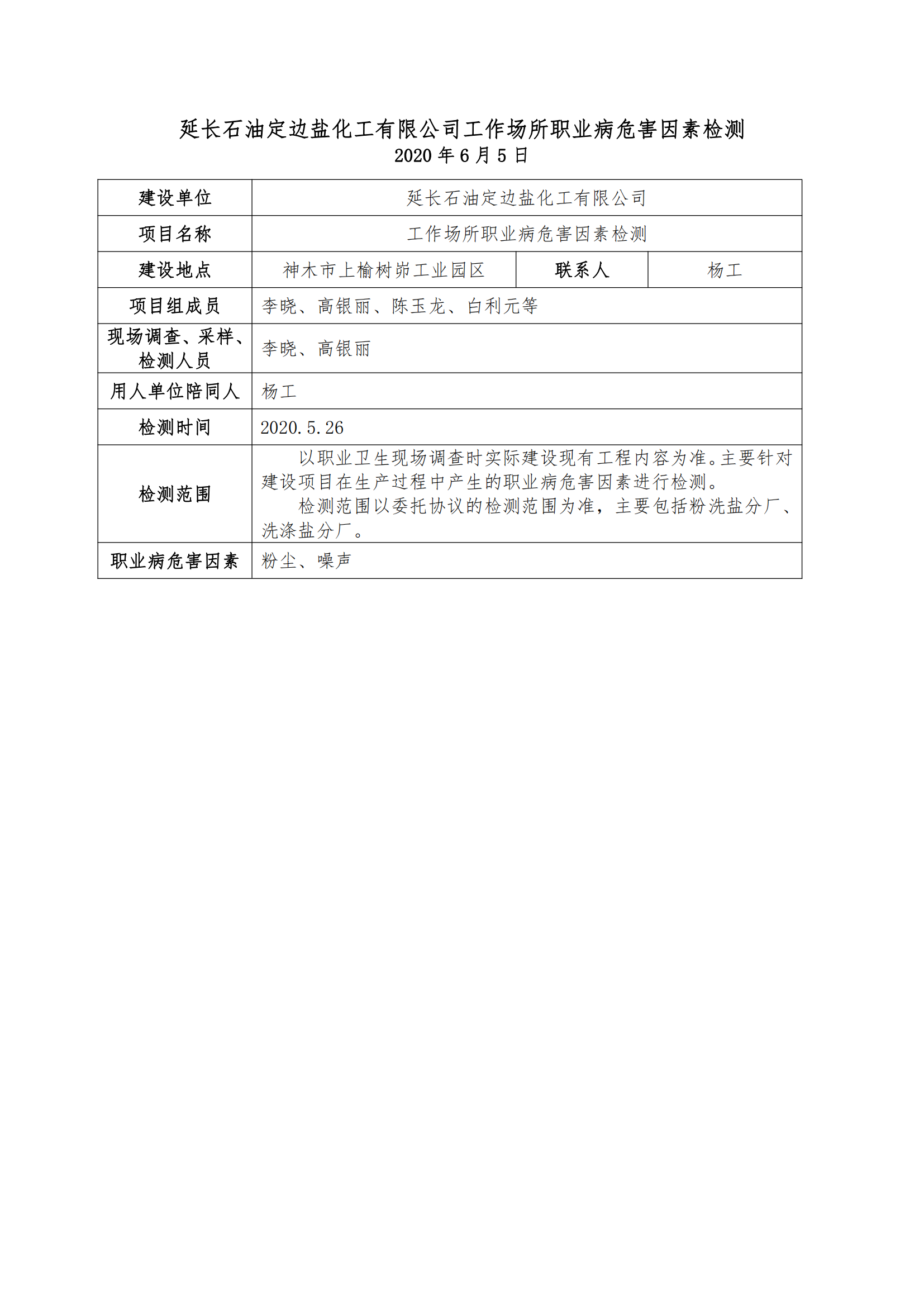延長石油定邊鹽化工有限公司工作場所職業(yè)病危害因素檢測