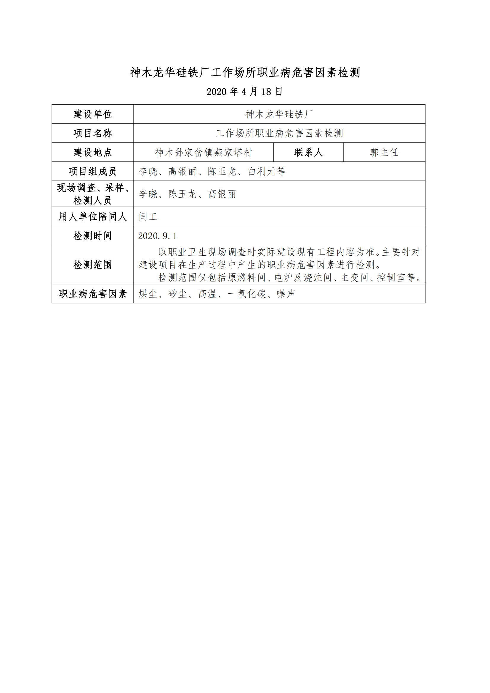 神木龍華硅鐵廠工作場所職業(yè)病危害因素檢測