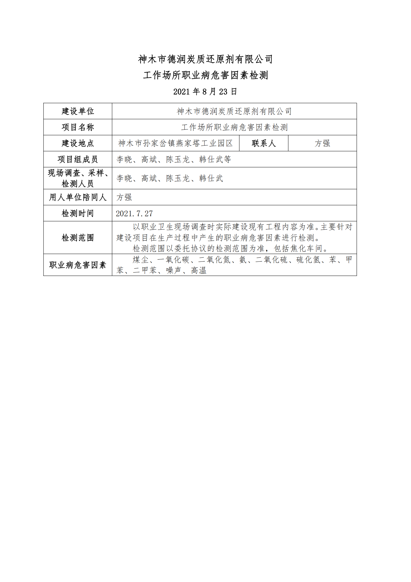 神木市德潤炭質還原劑有限公司工作場所職業病危害因素檢測