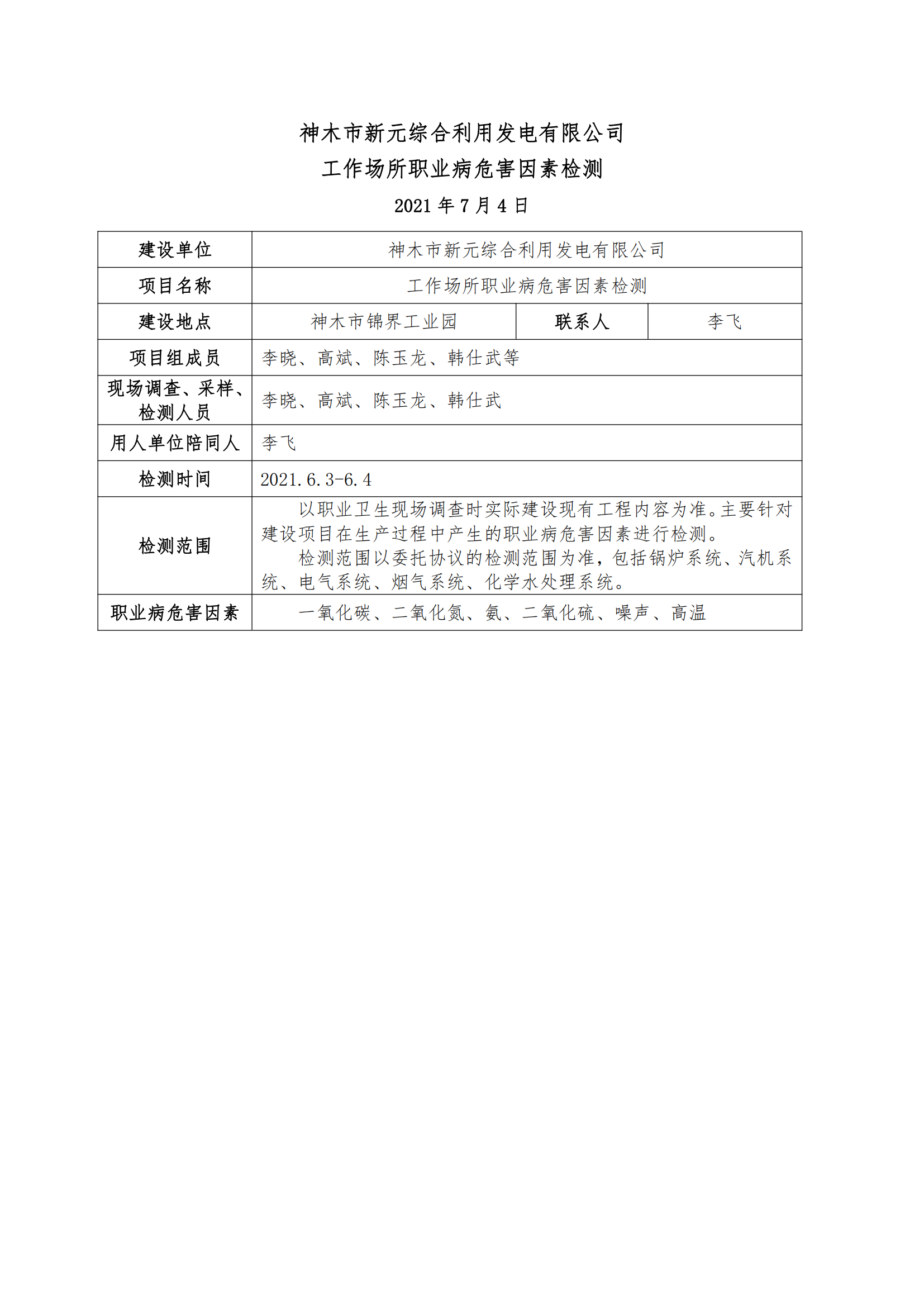 神木市新元綜合利用發(fā)電有限公司工作場所職業(yè)病危害因素檢測