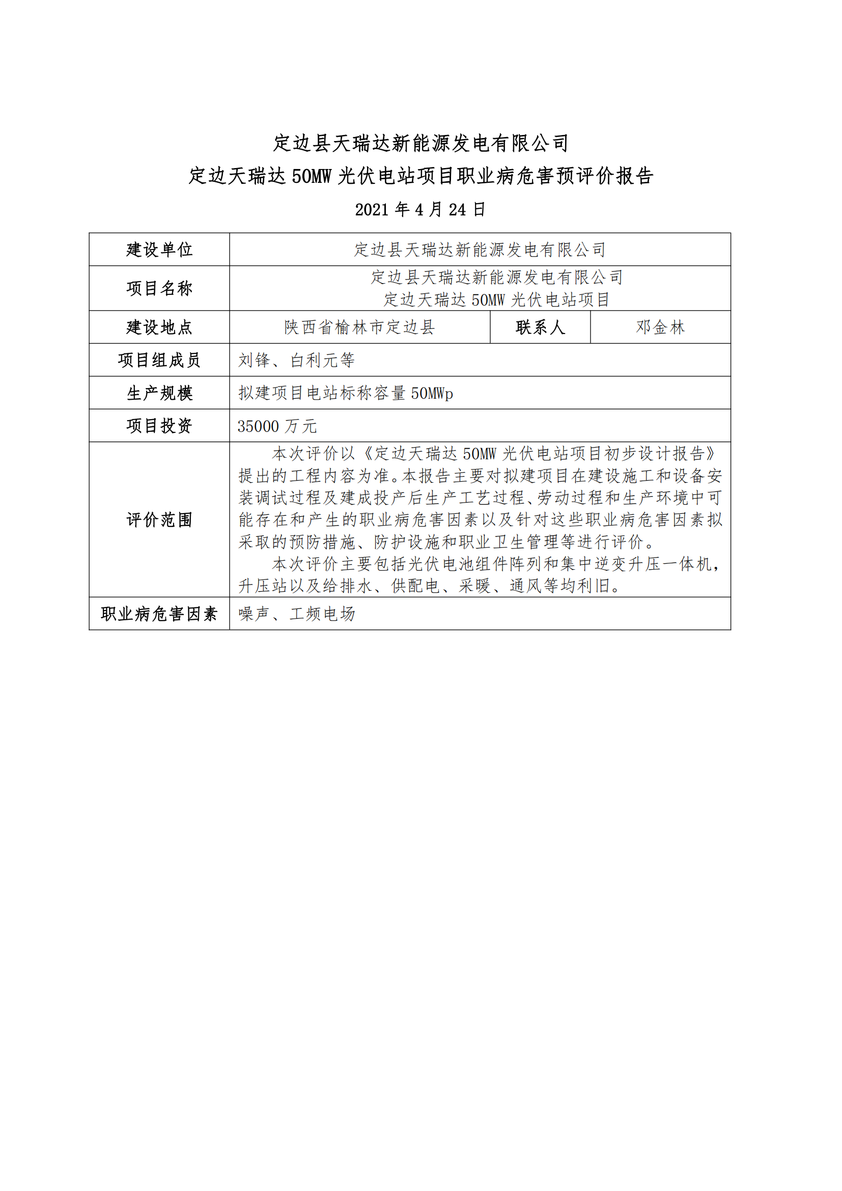 定邊縣天瑞達新能源發電有限公司定邊天瑞達50MW光伏電站項目職業病危害預評價報告