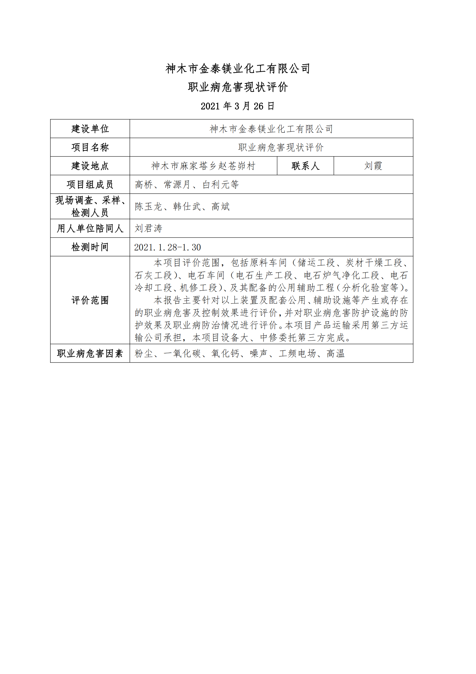 神木市金泰鎂業化工有限公司職業病危害現狀評價