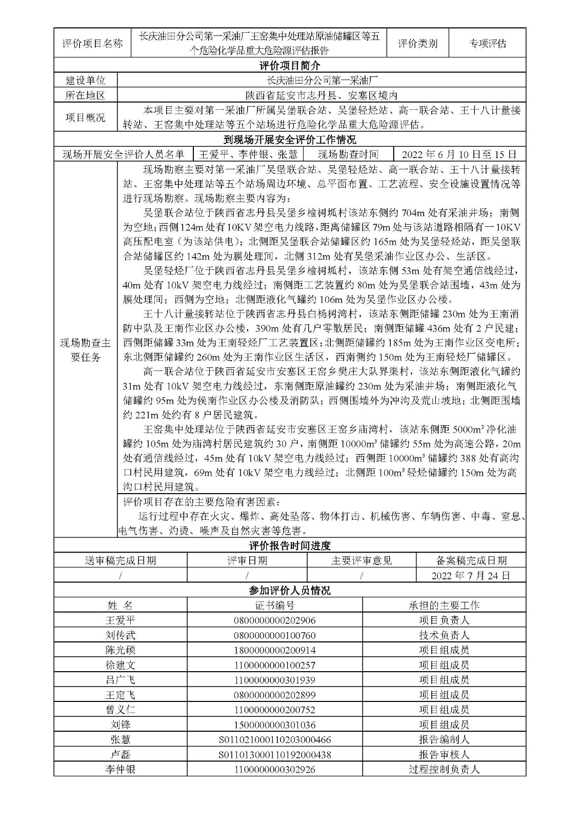 KLDAP[2022]-4.8 長慶油田分公司第一采油廠王窯集中處理站原油儲罐區等五個危險化學品重大危險源評估