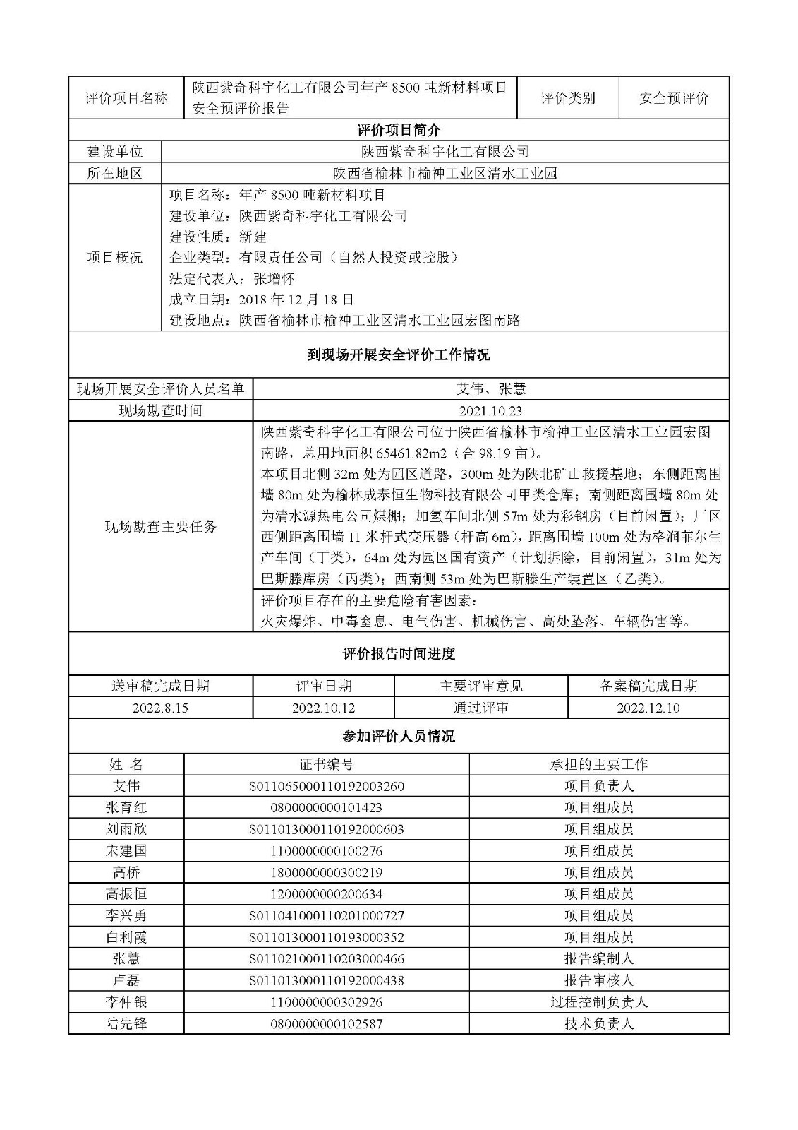 KLDAP[2021]-(預)-24 陜西紫奇科宇化工有限公司年產8500噸新材料項目安全預評價