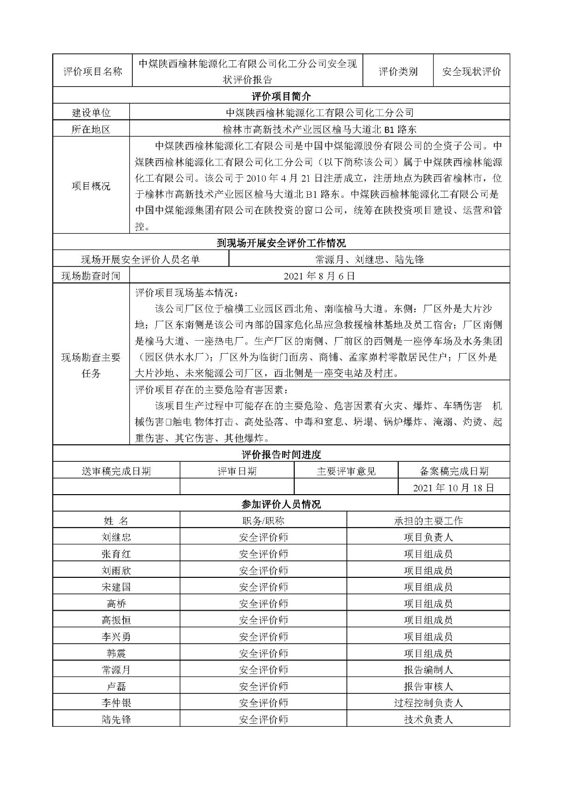 KLDAP[2021]-(現)-13 中煤陜西榆林能源化工有限公司化工分公司安全現狀評價