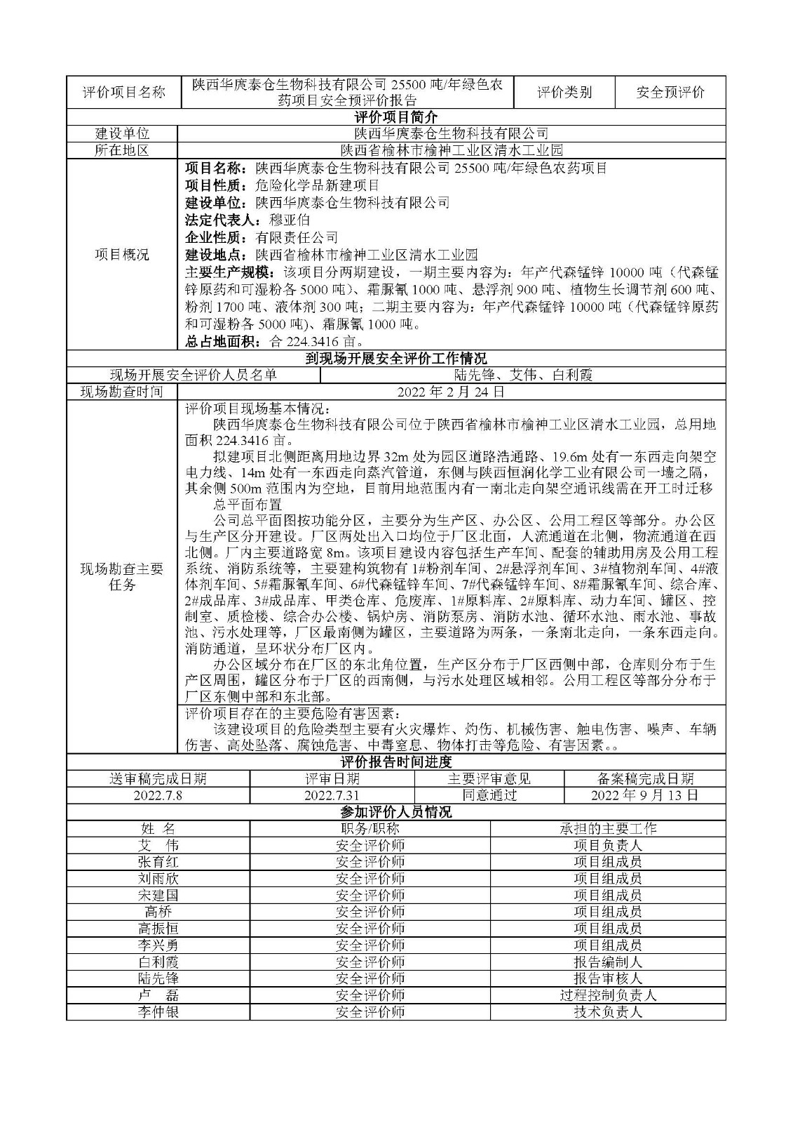 KLDAP[2021]-(預)-22 陜西華庹泰倉生物科技有限公司25500噸/年綠色農藥項目安全預評價