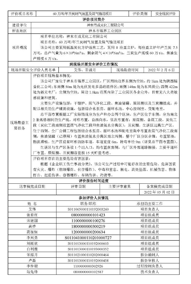 KLDAP[2022]-3.3 神木市成元化工有限公司60萬(wàn)噸/年蘭炭制氣裝置及煤氣輸送項(xiàng)目安全現(xiàn)狀