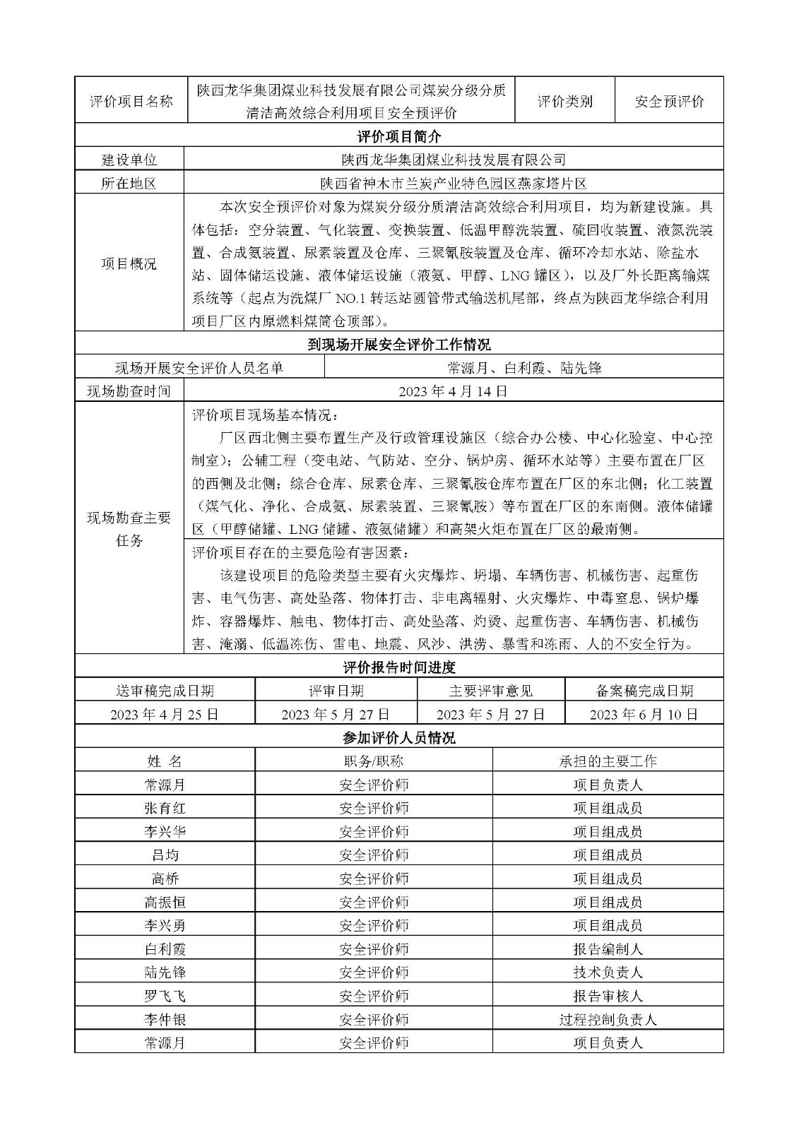 KLDAP[2023]-3.1 陜西龍華集團煤業科技發展有限公司煤炭分級分質清潔高效綜合利用項目安全預評價