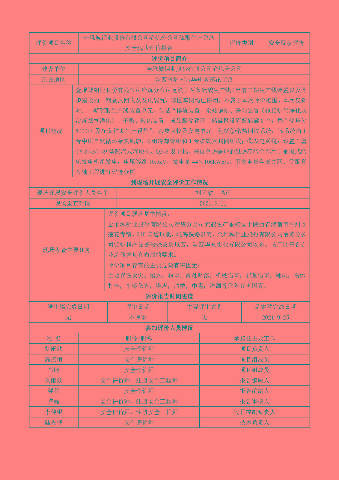 KLDAP[2021]-(現(xiàn))-11 金堆城鉬業(yè)股份有限公司礦冶分公司硫酸廠硫酸生產項目安全現(xiàn)狀評價