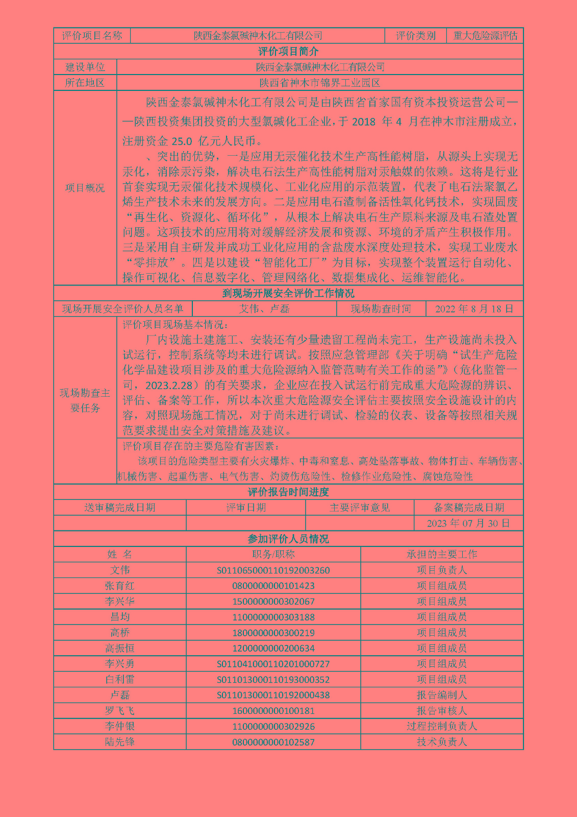 KLDAP[2022]-1.7 神木金泰氯堿神木化工有限公司重大危險源安全評估