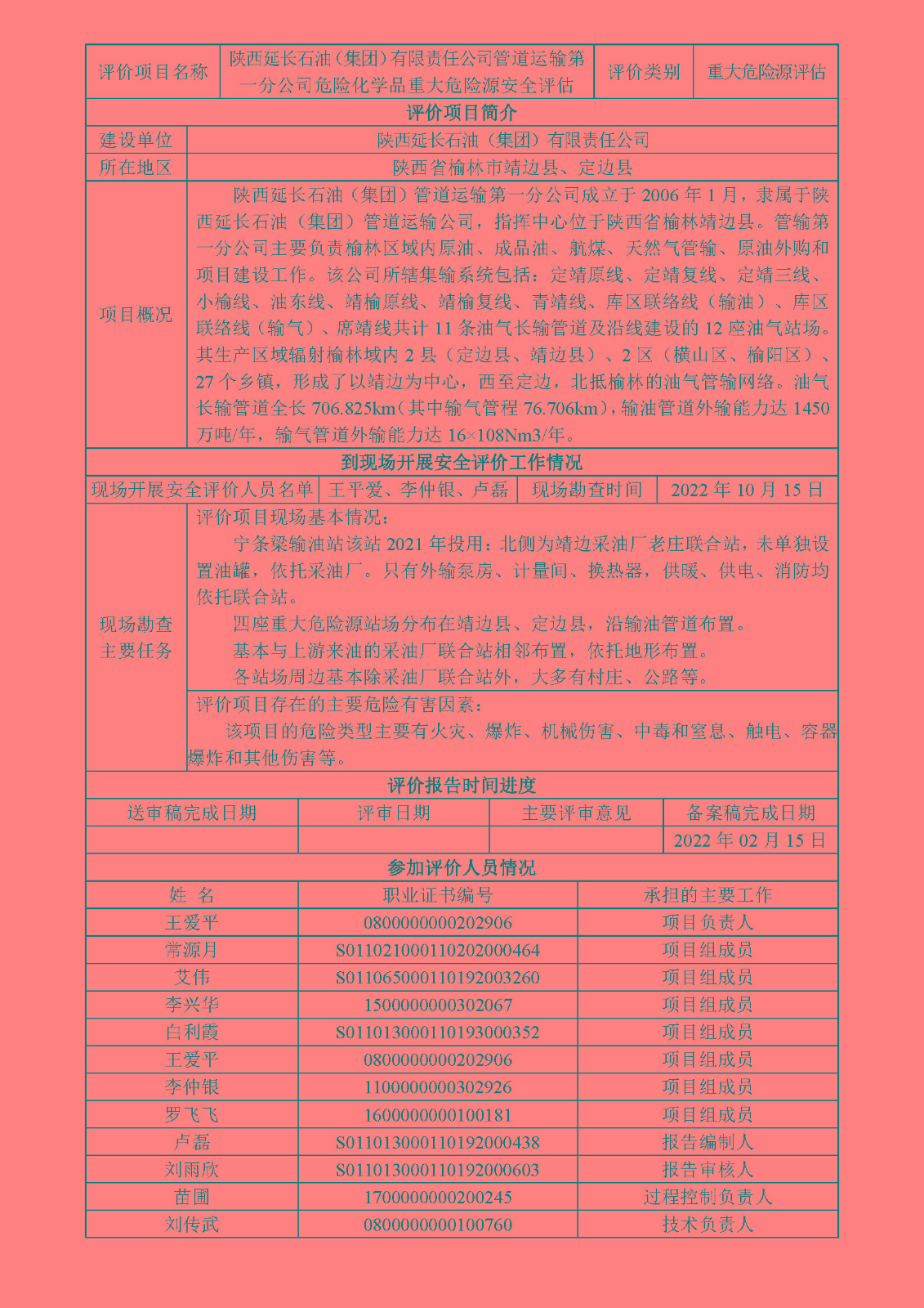 KLDAP[2022]-1.10 陜西延長石油(集團)有限責任公司管道運輸第一分公司重大危險源安全評估
