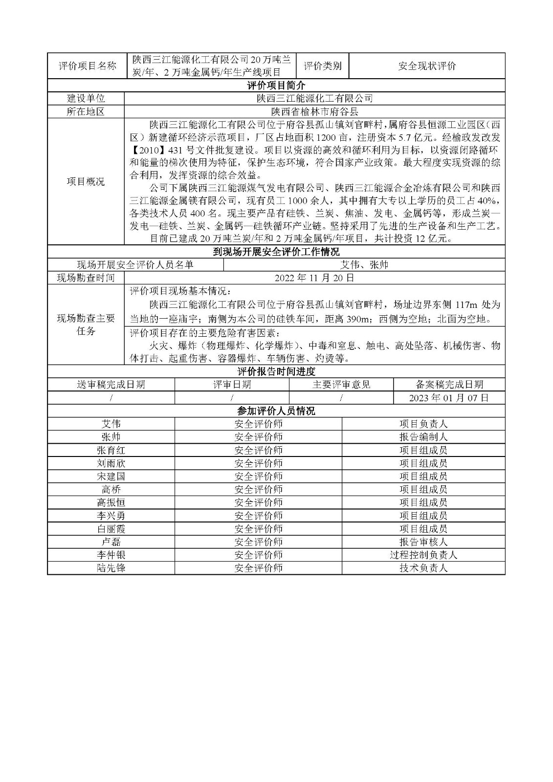 KLDAP[2022]-1.12 陜西三江能源化工有限公司20萬噸蘭炭/年、2萬噸金屬鈣/年生產線項目安全現狀評價