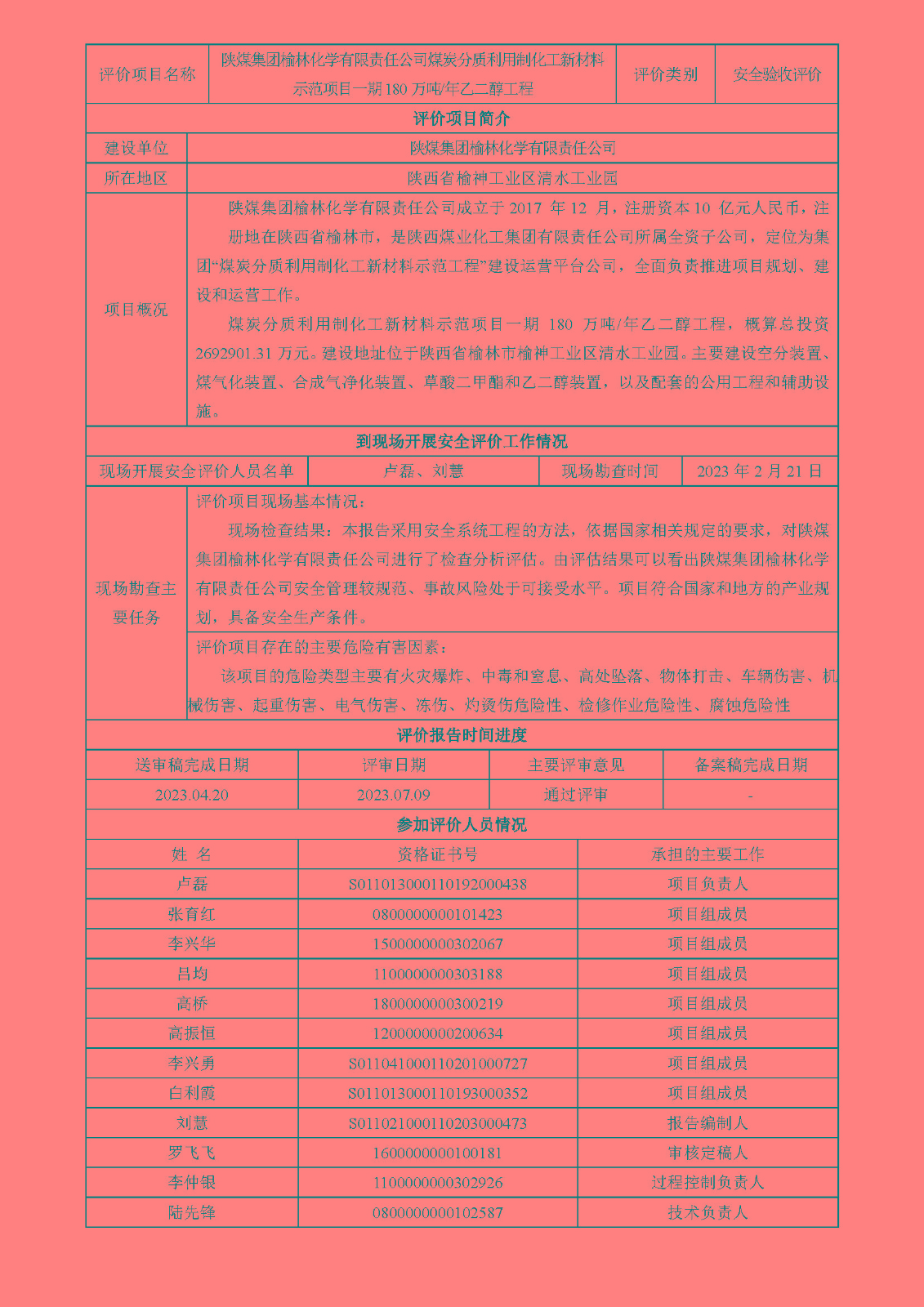 KLDAP[2023]-1.1 陜煤集團(tuán)榆林化學(xué)有限責(zé)任公司煤炭分析利用制化工新材料示范項(xiàng)目一期180萬噸/年乙二醇工程安全驗(yàn)收評價(jià)驗(yàn)收