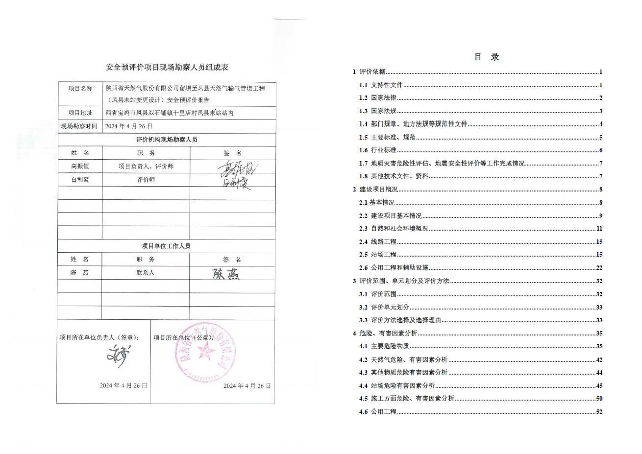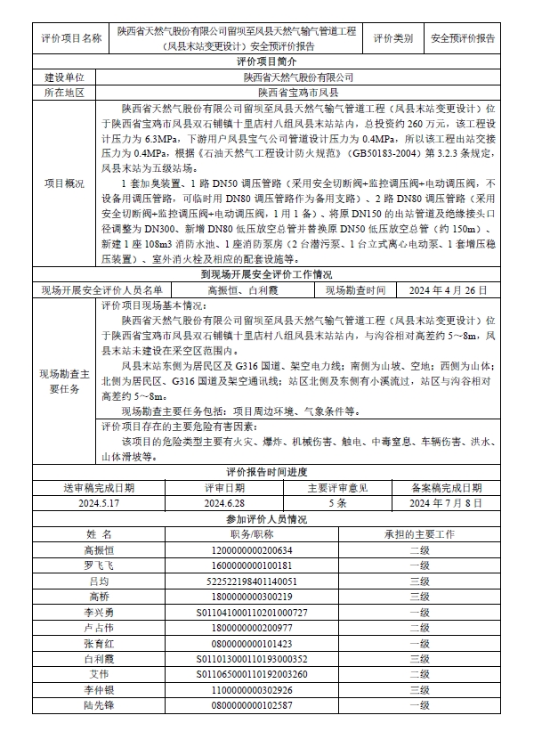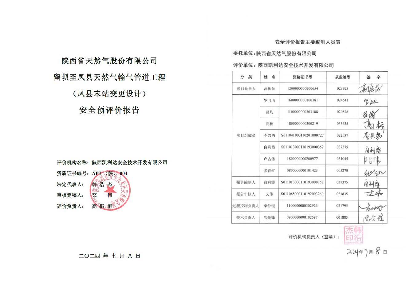 KLDAP[2024]-3.8陜西省天然氣股份有限公司留壩至鳳縣天然氣輸氣管道工程(鳳縣末站變更設計)安全預評價