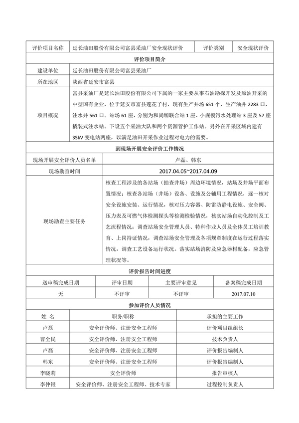 延長(zhǎng)油田股份有限公司橫山采油廠安全現(xiàn)狀評(píng)價(jià)