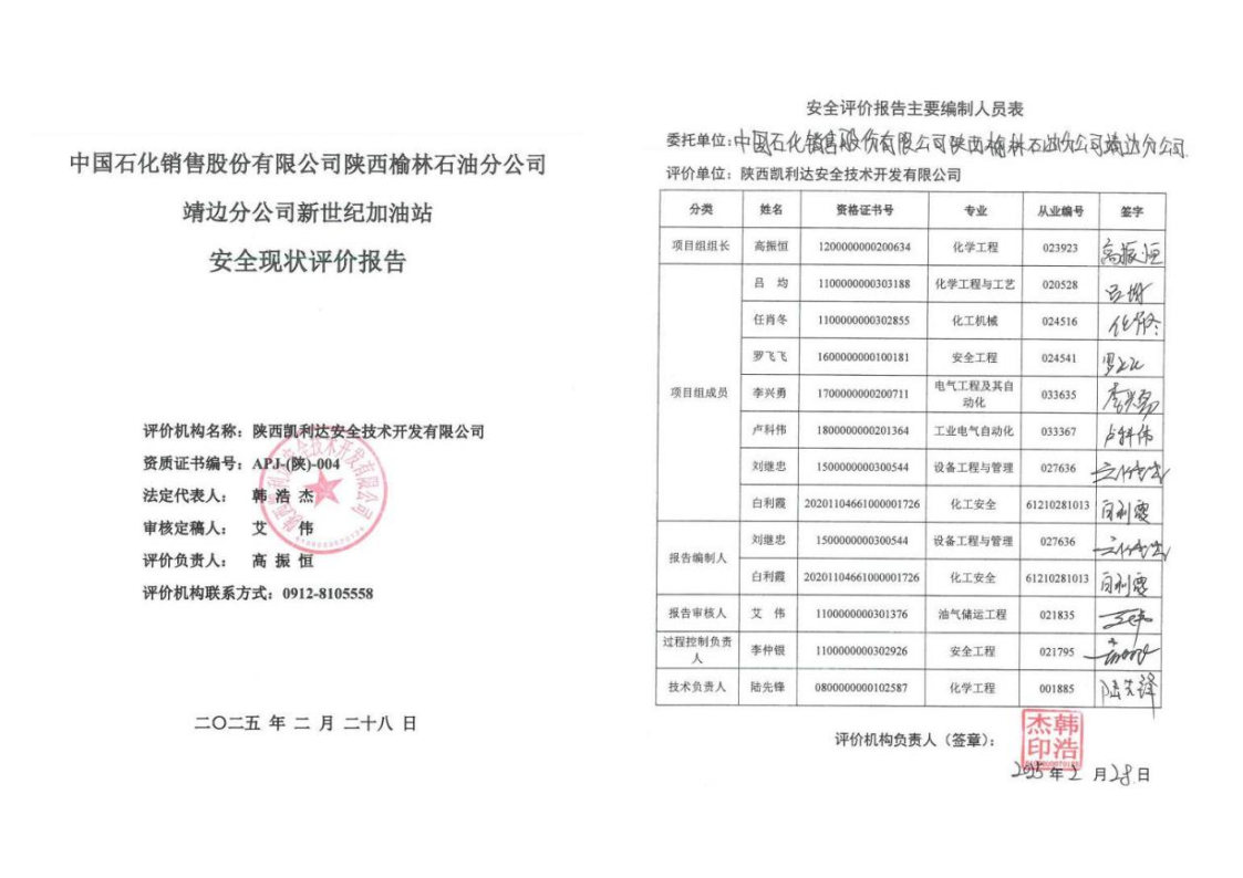 中國石化銷售股份有限公司陜西榆林石油分公司靖邊分公司新世紀加油站安全現狀評價報告
