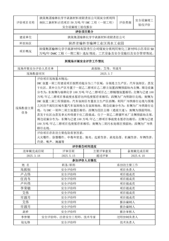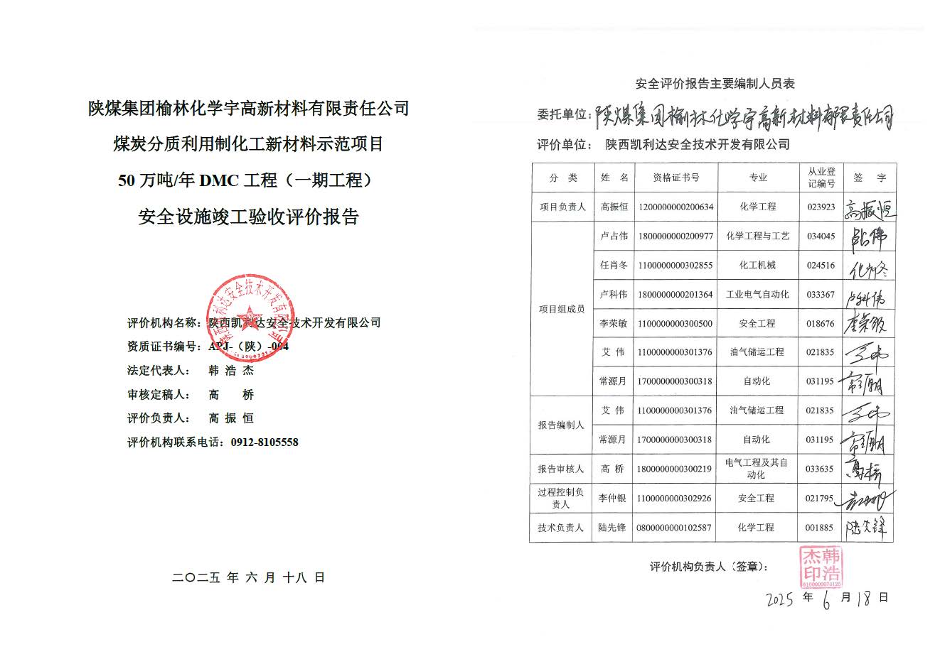 KLDAP[2025]-2.11-陜煤集團榆林化學宇高新材料有限責任公司煤炭分質利用制化工新材料示范項目50萬噸年DMC工程(一期工程)安全設施竣工驗收評價